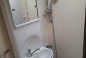 Adjacent to the kitchen is the wetroom with a toilet, a hand basin, and a shower that can be screened off.