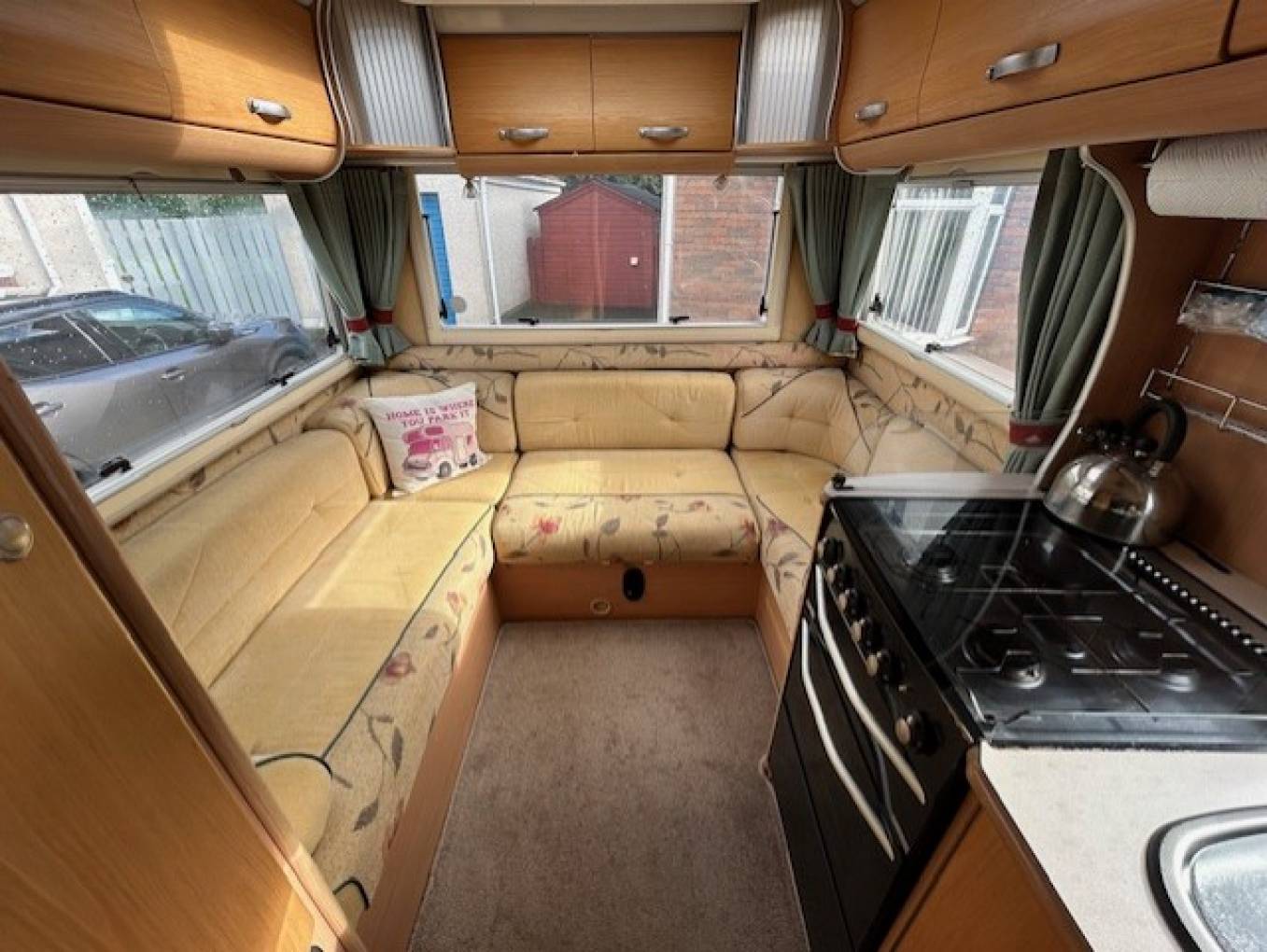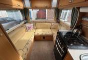 The kitchen consists of 4 burner gas hob, grill/oven, Dometic fridge with cooler box, sink and additional workspace provided by elevating leaf.