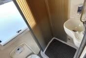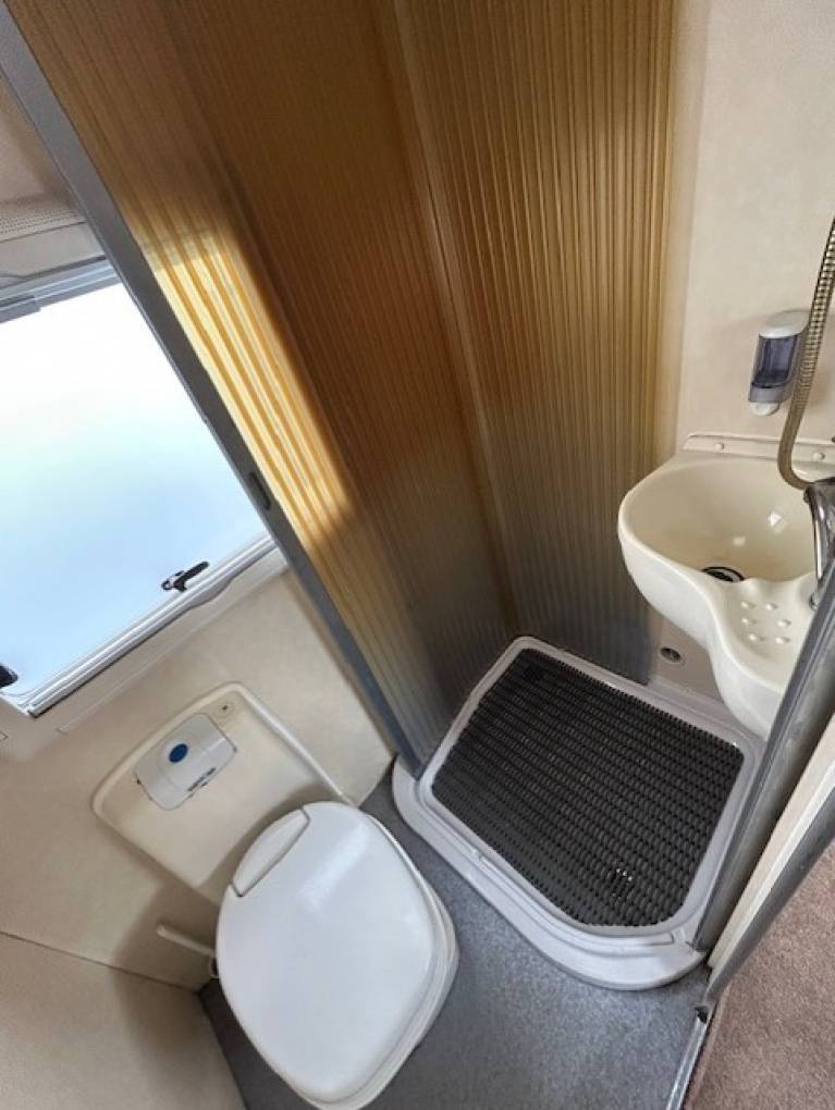 The central washroom has a washbasin, swivel cassette toilet and a shower.