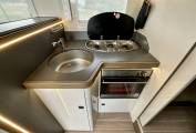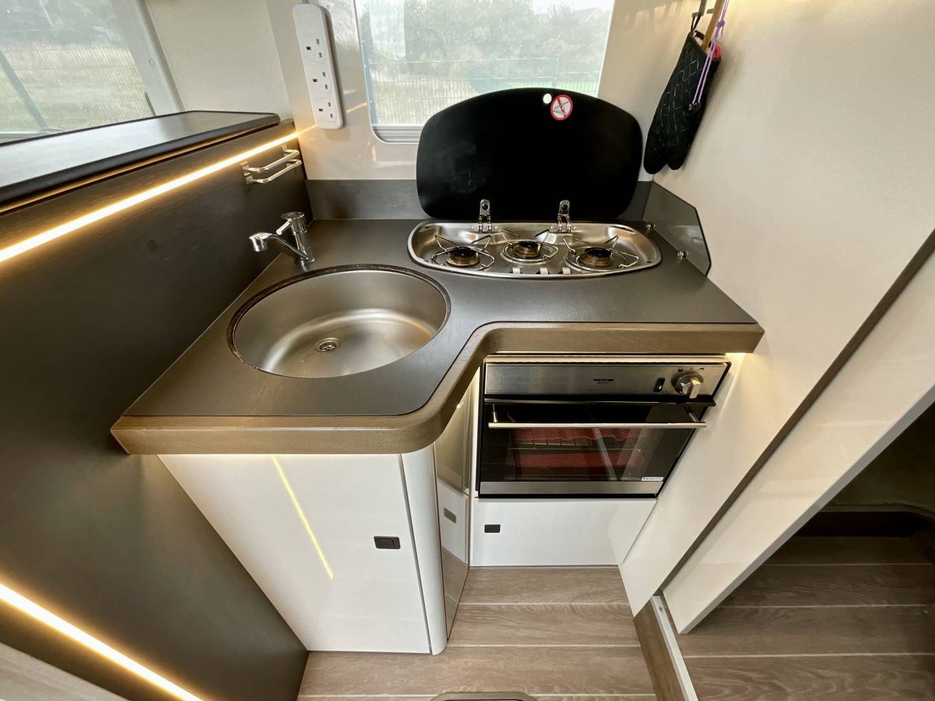 The kitchen is fully equipped with oven and grill, gas hobs, three way fridge/freezer, additional preparation space and plenty of storage for cutlery, crockery and condiments.