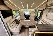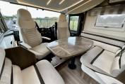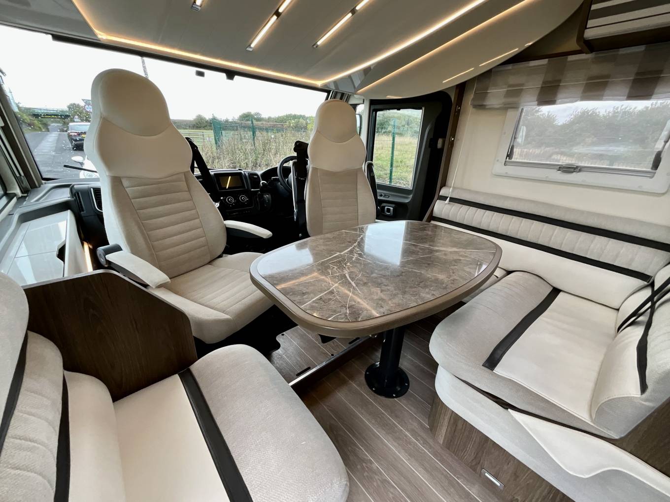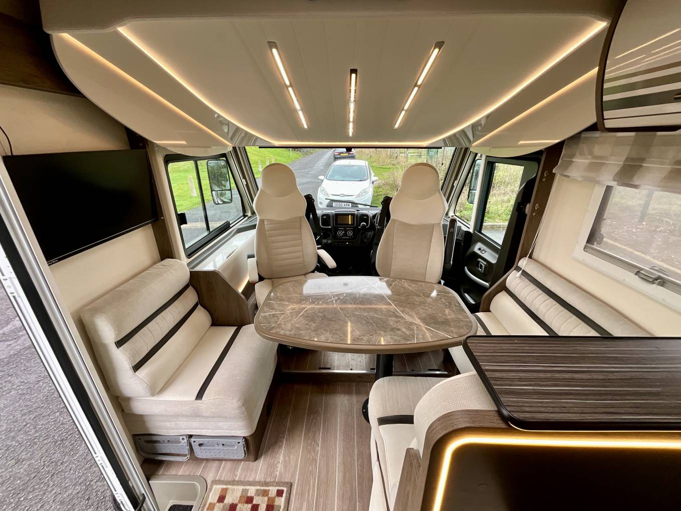 The driver and passenger seats swivel to face the adjustable lounge table, around which you can comfortably seat five. To keep the space heated, the Truma dual fuel heating system powers both heating and hot water.