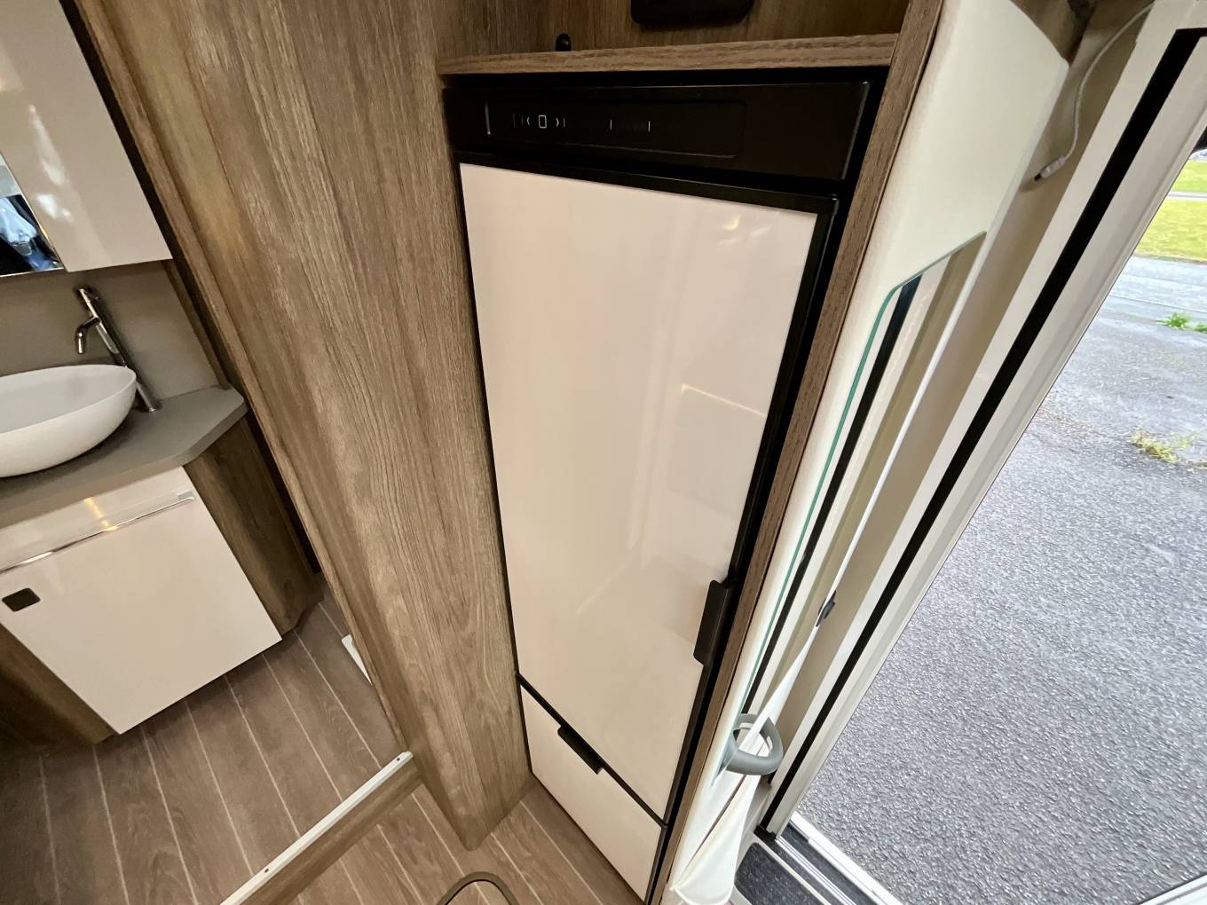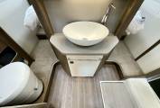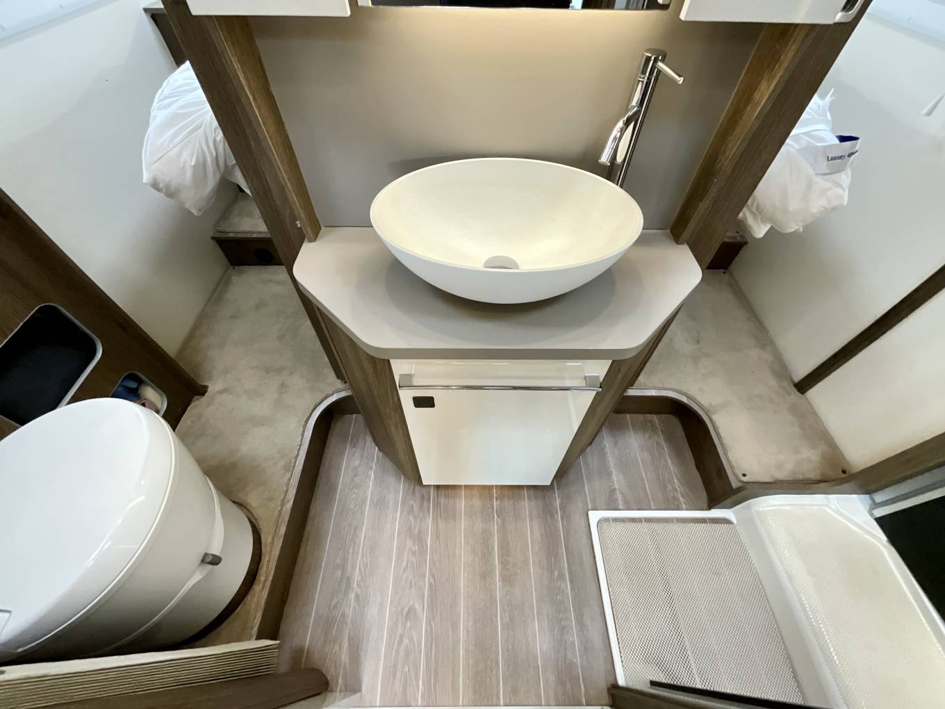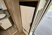 Behind the kitchen, a partitioned washroom is equipped with Thetford toilet with cassette, shower cubicle, washbasin, vanity unit and plenty of storage.
