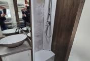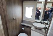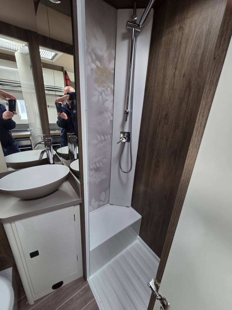 The washroom is located opposite and comprises of a separate shower, hand wash basin with vanity unit and a Thetford cassette toilet.