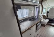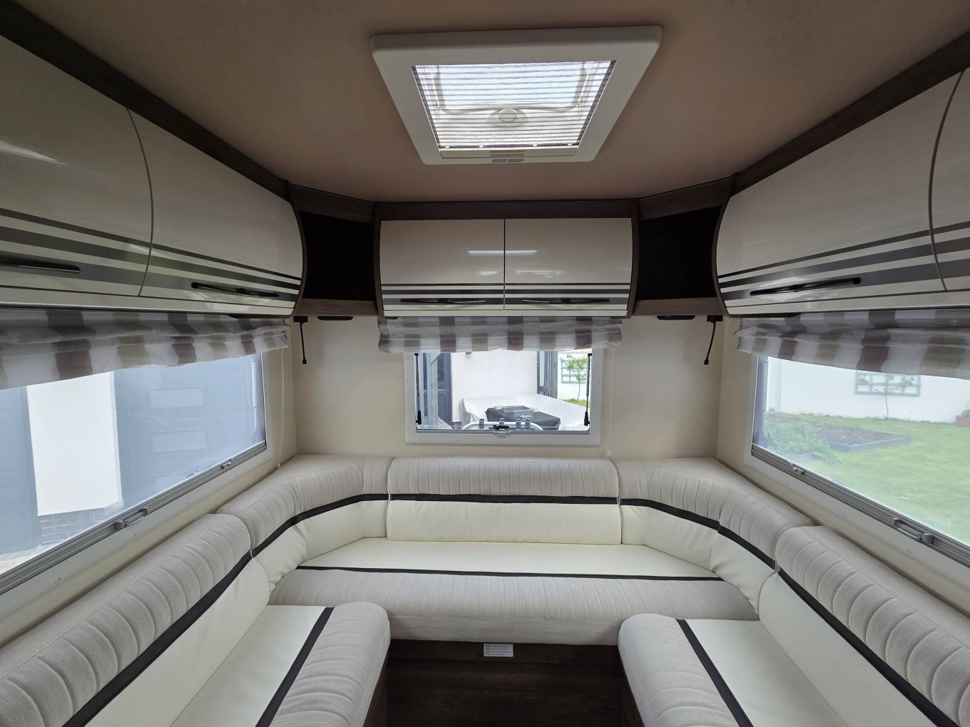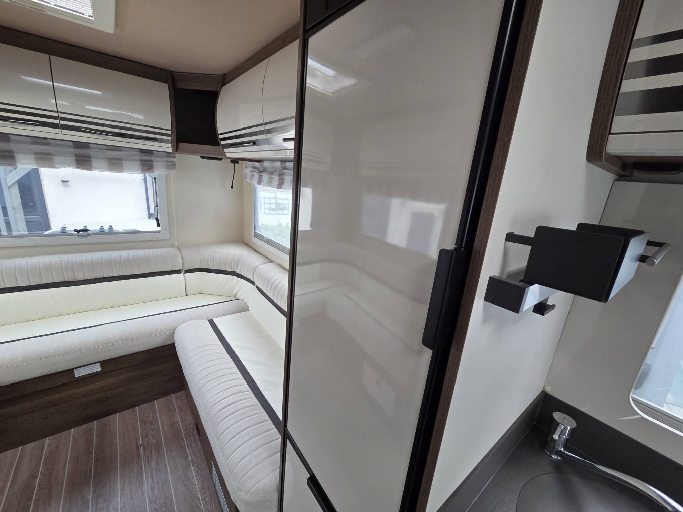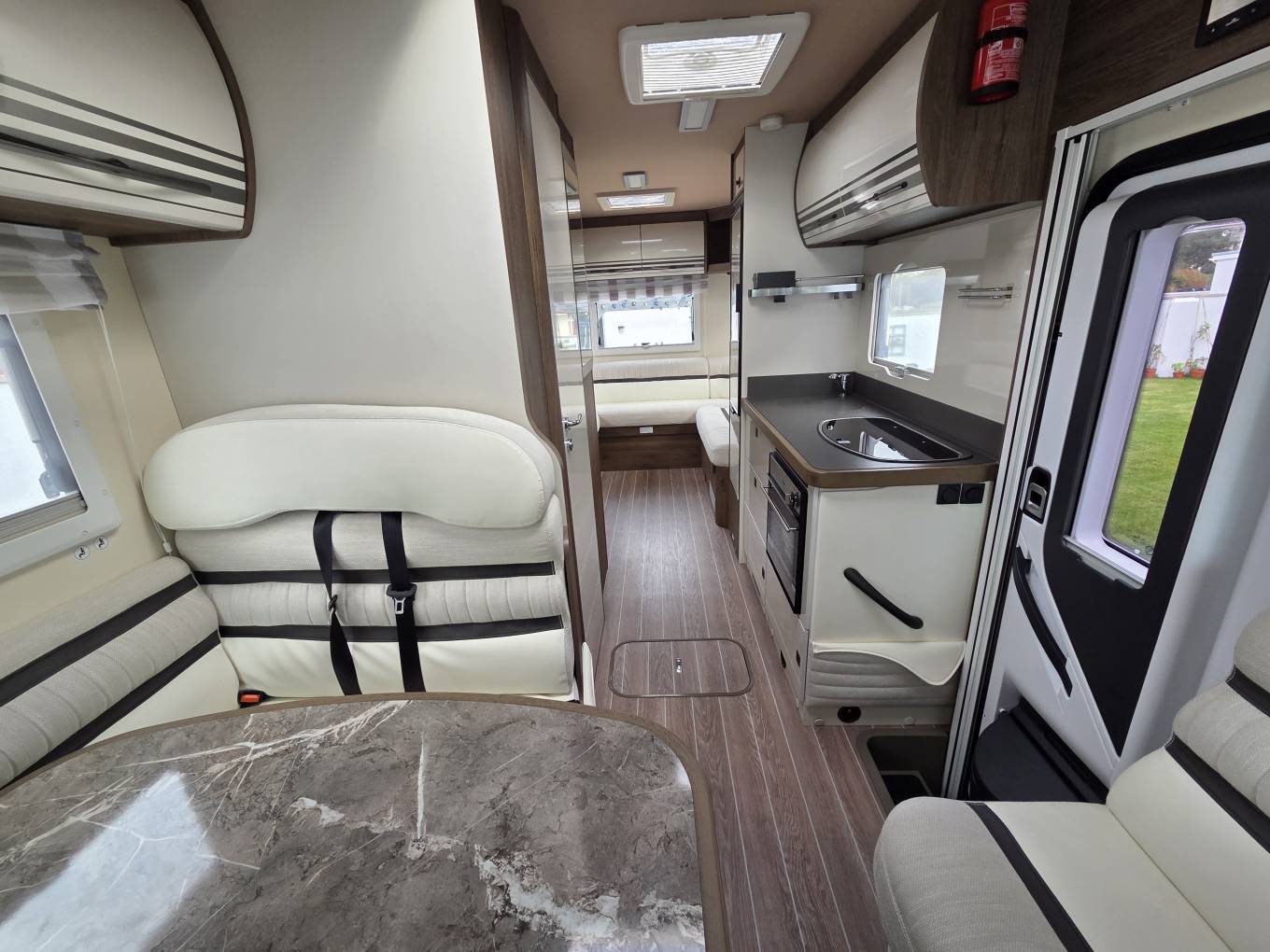 Situated below the bed you will find the two swivel Captain seats, a side-facing bench and a forward-facing dinette which provides the additional two 3-point travelling seatbelts, which comfortably seats 6 people to dine.