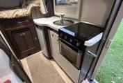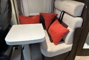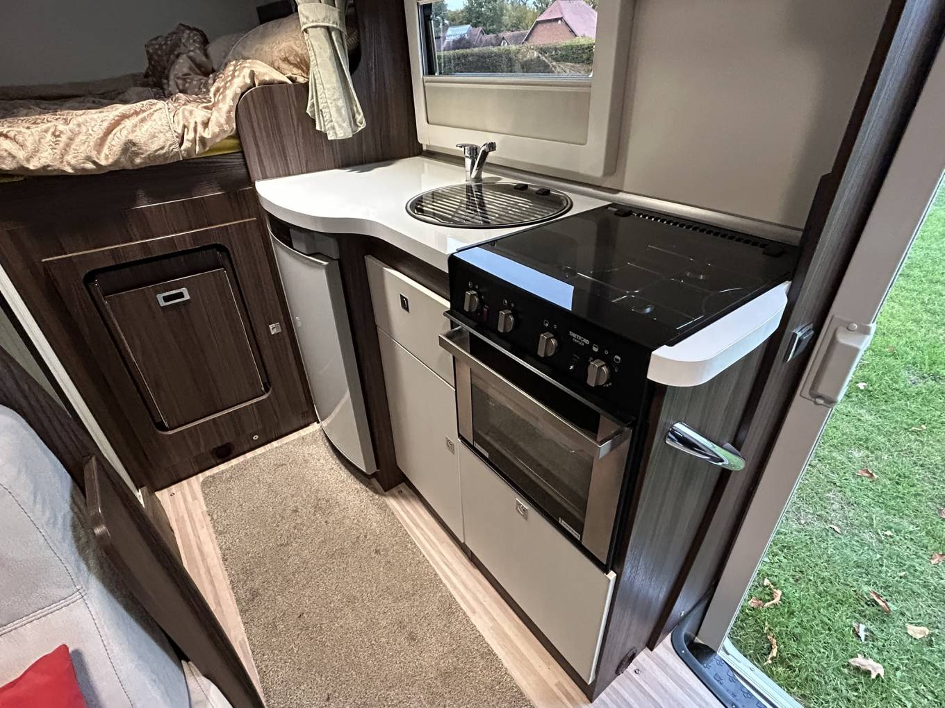 Inside, the kitchen is well-equipped with a microwave, gas hob, sink, and fridge freezer, along with plenty of storage space. The Truma heating and boiler system ensures warmth and hot water whether you're on a site or off-grid. A wind-out awning provides shade and shelter for outdoor dining or relaxing.