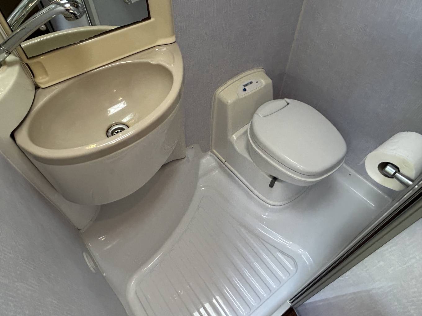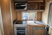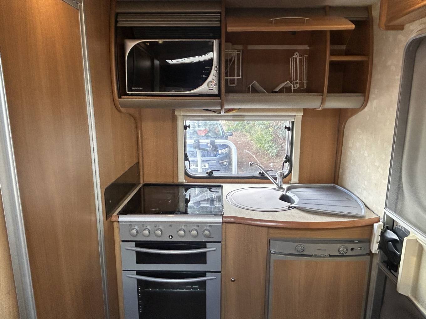 Inside, the thoughtfully designed layout features an end kitchen fitted with an oven, grill, and microwave, giving you everything you need to cook delicious meals on the go. The washroom is well equipped with a shower, Thetford cassette toilet, wash basin with mixer tap, and a bathroom storage cabinet, providing all the essentials for comfortable touring.