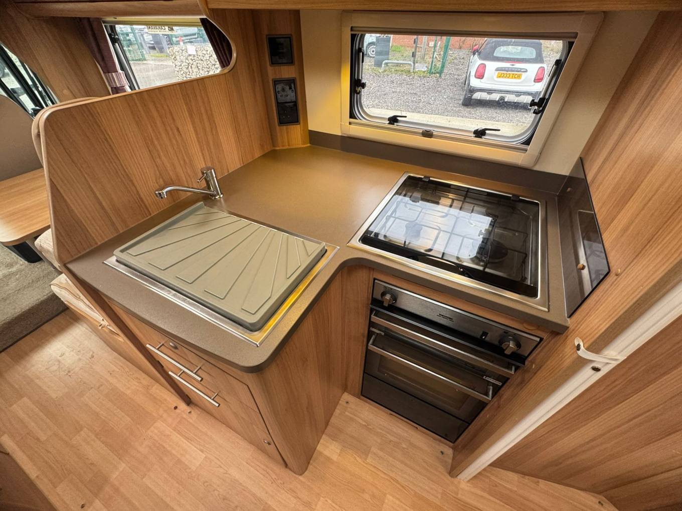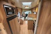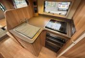 Step inside and you’re welcomed by a well-appointed kitchen area with an L-shaped worktop—perfect for prepping meals on the go. The large Dometic fridge/freezer, microwave, 3-burner hob, oven, and grill give you everything you need to cook up a feast, whether you're parked by the beach or deep in the countryside.