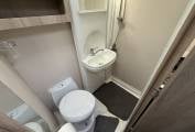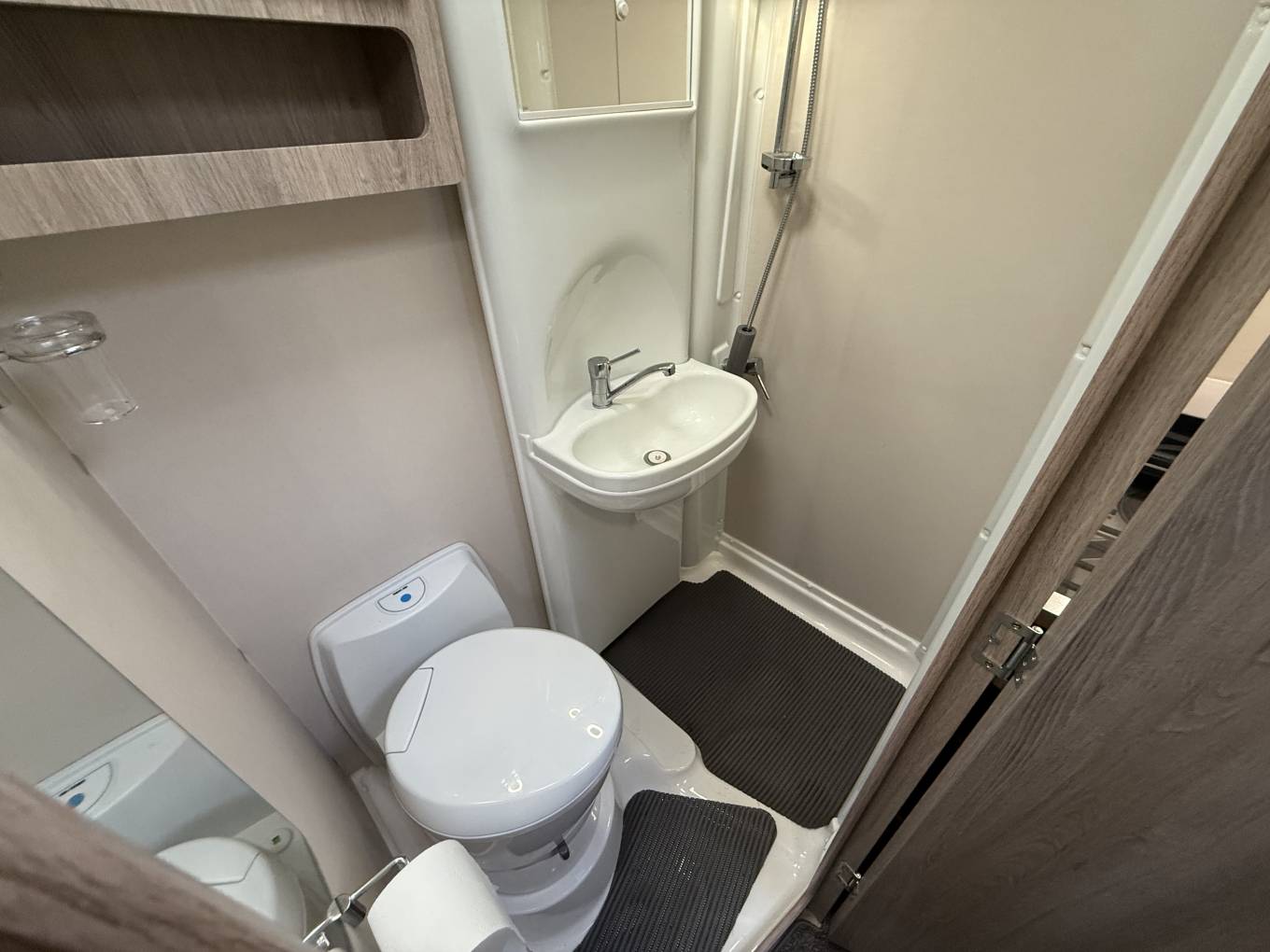 Here there is a Thetford Flushing Cassette Toilet, a Wash Handbasin and by swinging the wall around a Shower Cubicle.