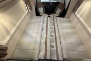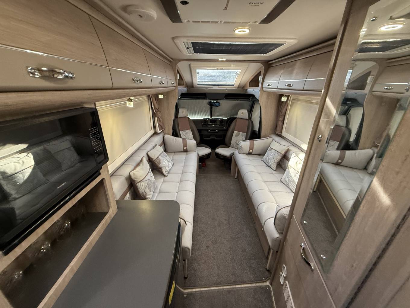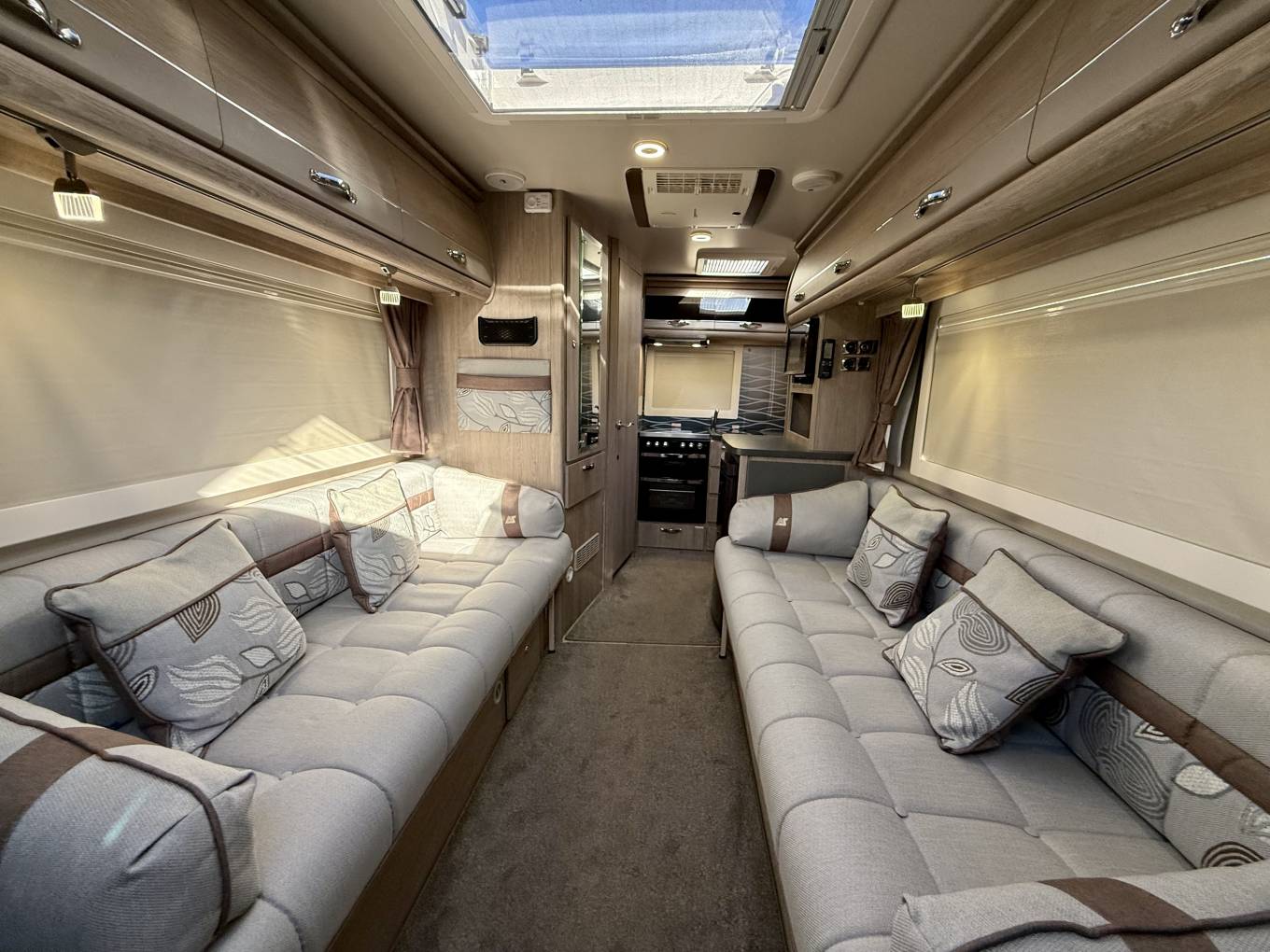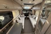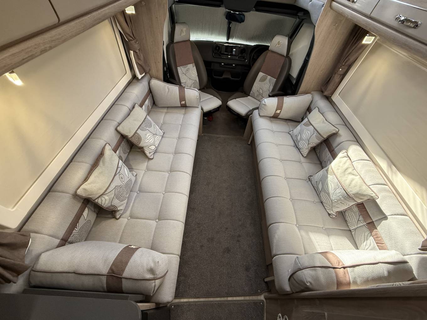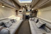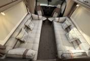 Across the centre of the motorhome is the Spacious Lounge Area comprising of two long Inward Facing Settees complimented by Twin Swivelling Cab Chairs.