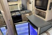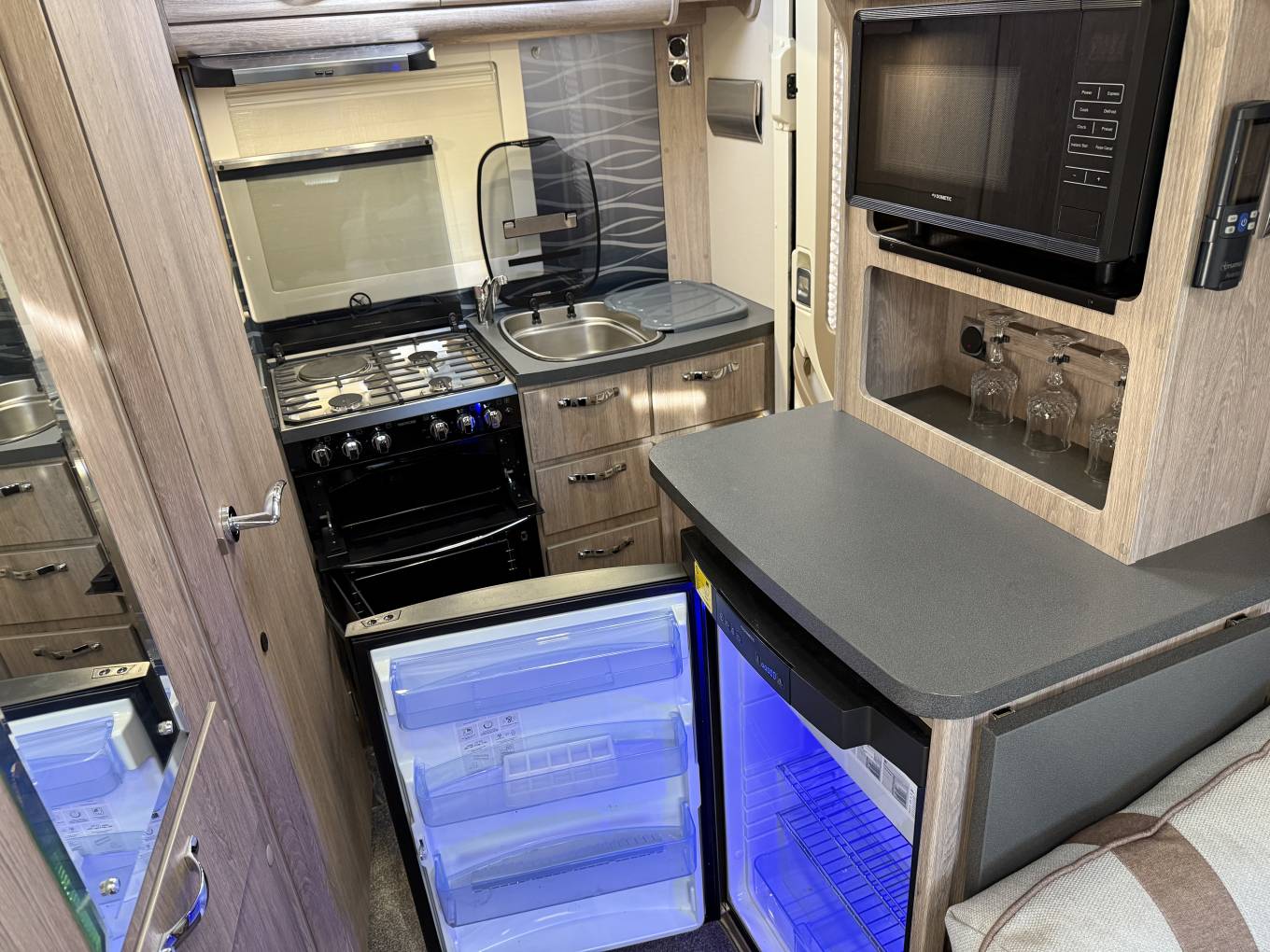 On entering up the electrically operated step through the Flyscreen Protected Habitation Door you enter the fully quipped kitchen where you will find a spotless Three Gas burner and One Electric Hotplate Hob with an Extractor Fan above, separate Grill and Oven, a Three Energy Source Dometic Fridge, a Microwave Oven, a Sink with a Hot & Cold Mixer Tap and removable Drainer, an extendable worktop and plenty of cupboard and drawer space.