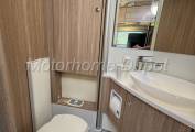 Opposite is the all in one bathroom with a cassette style fresh water flush toilet with white sink & chrome mixer tap above. Burstner’s clever swing-wall design, allows the shower wall to slide across and keep the toilet area dry whilst in use – an ingenious, space-efficient solution.