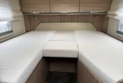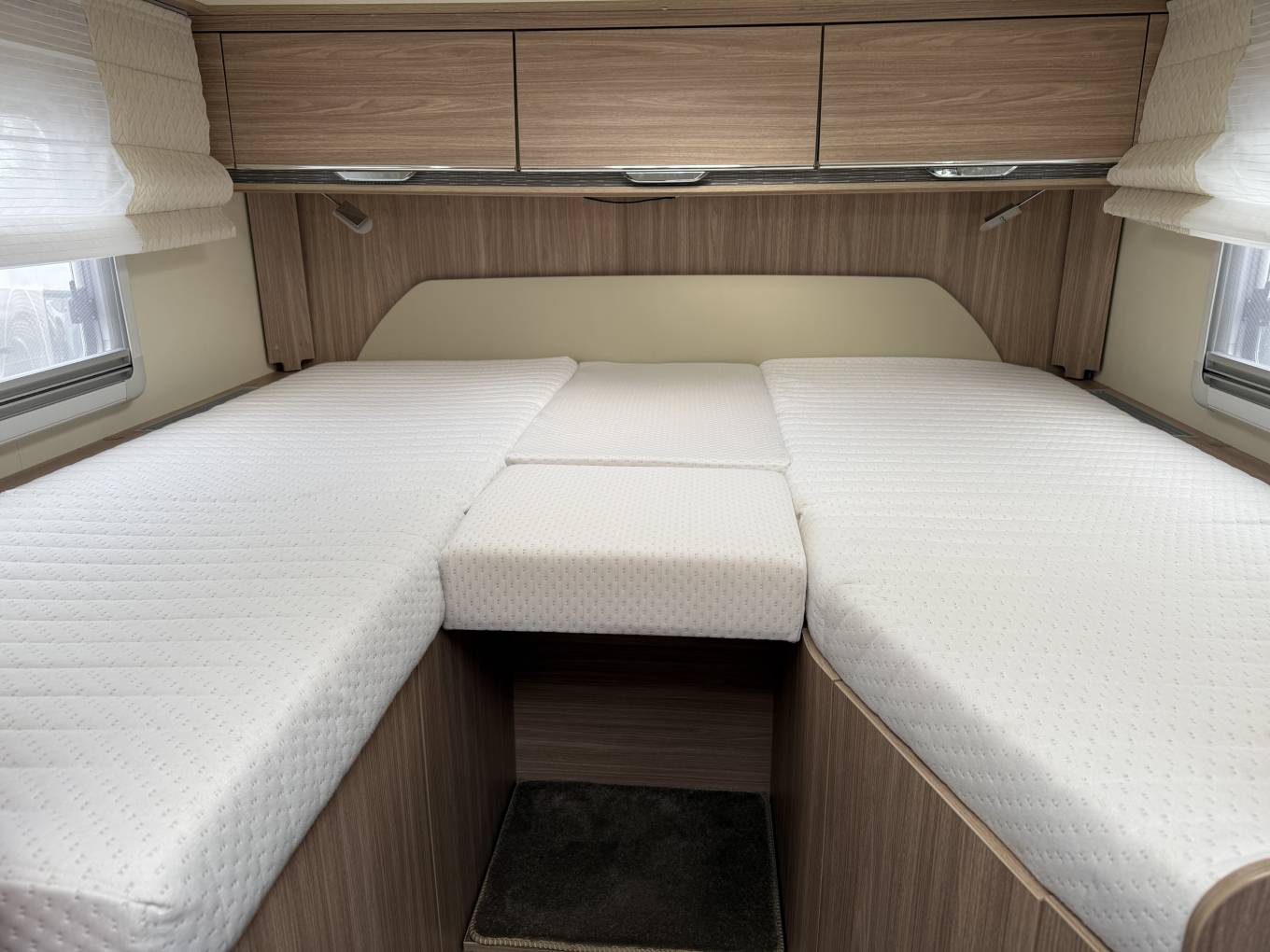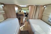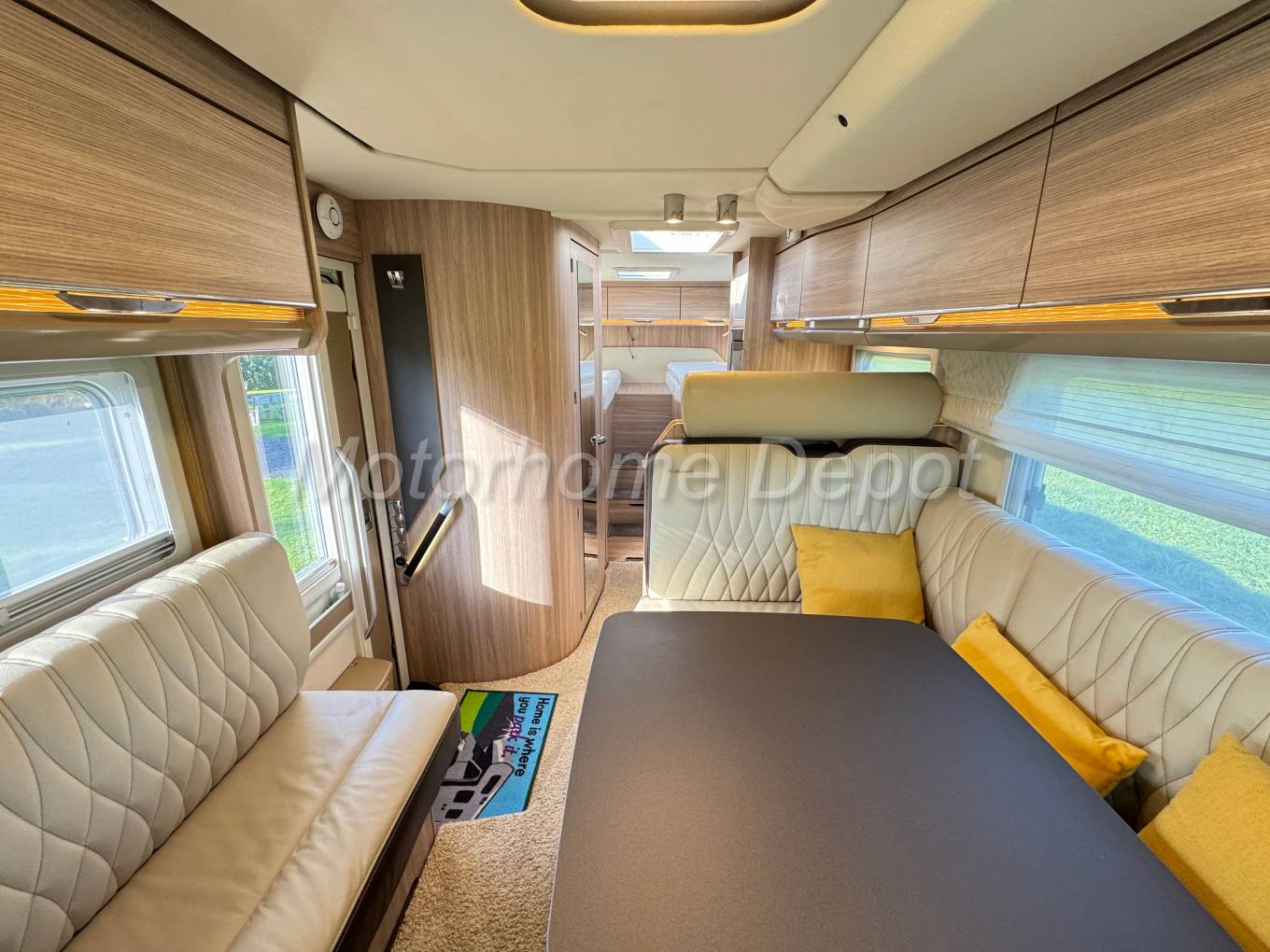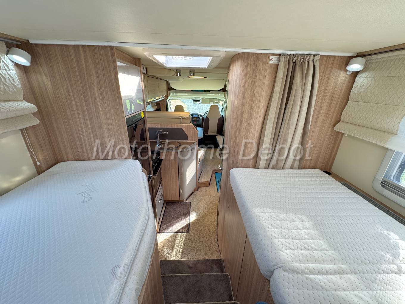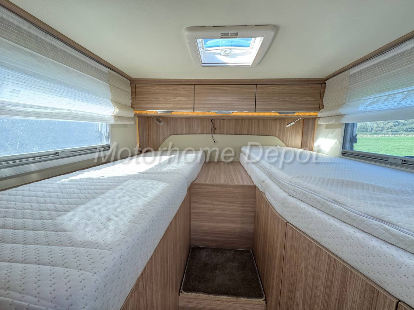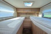 To the rear, the main bedroom with twin single beds over a large garage compartment, offering excellent comfort and practicality. Both beds incline for reading and provide wardrobe and under-bed storage, with an infill cushion available to create a larger double bed when preferred.