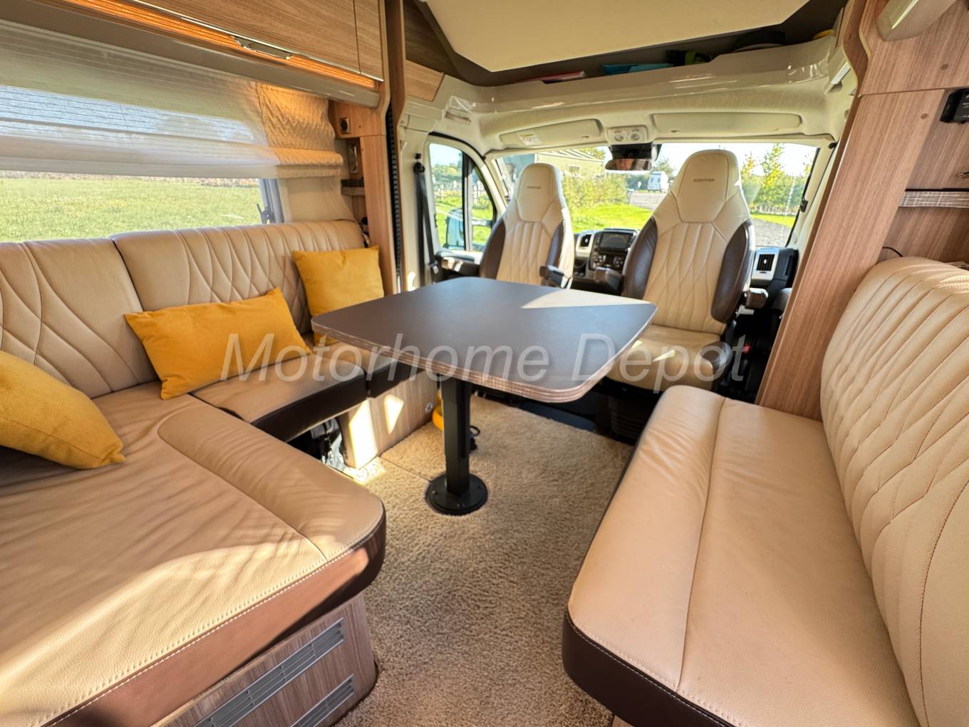 The spacious front dinette is one of the Ixeo’s highlights – a large, sociable lounge area with seating for between 6 & 8 people around a centrally positioned floor-mounted table. Above, is a longitudinal electric drop-down double bed which lowers smoothly from the ceiling, providing a comfortable sleeping area without compromising daytime space.
