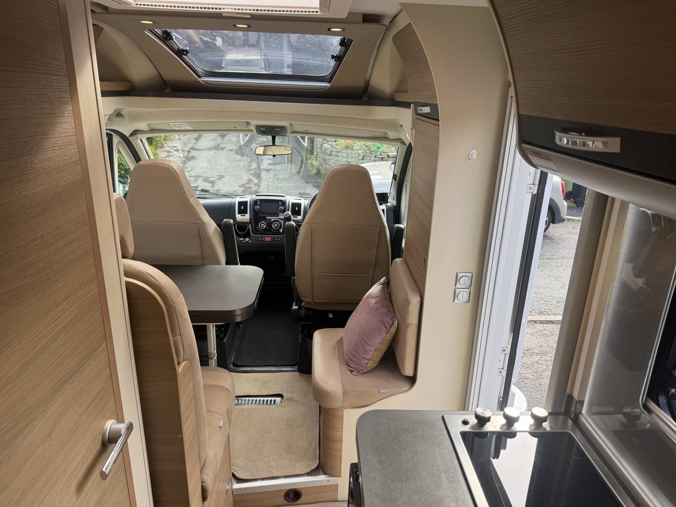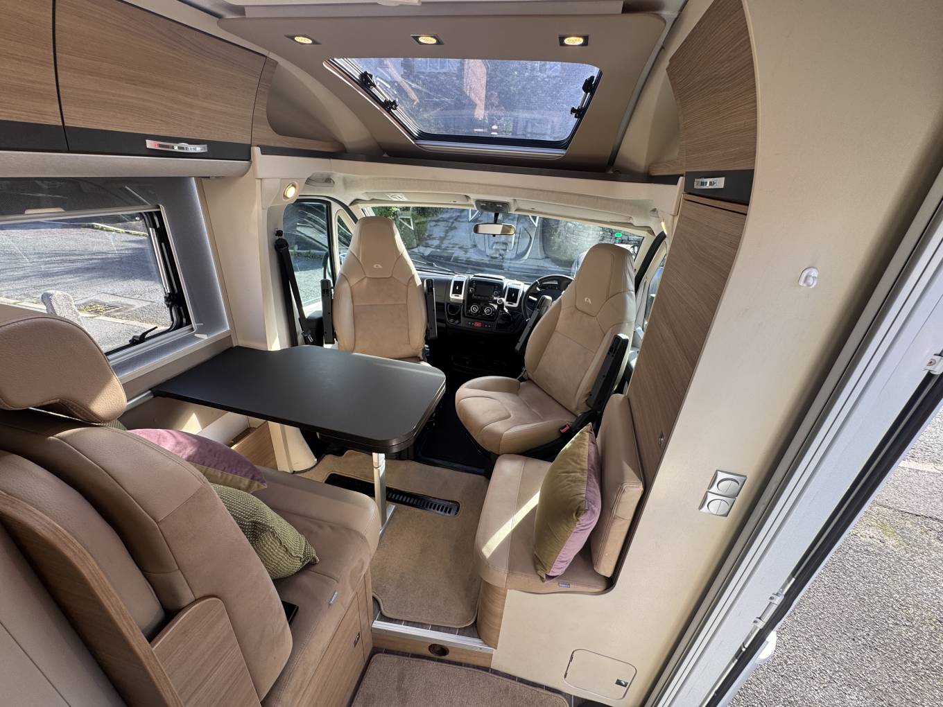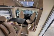 As we head towards the front of the motorhome, we come to the lounge/dining area where there are the rear two travelling seats form part of a L shape sofa along with the driver and passenger seats that both swivel to face the large dining table that is positioned in between which offers that warm family dining experience.