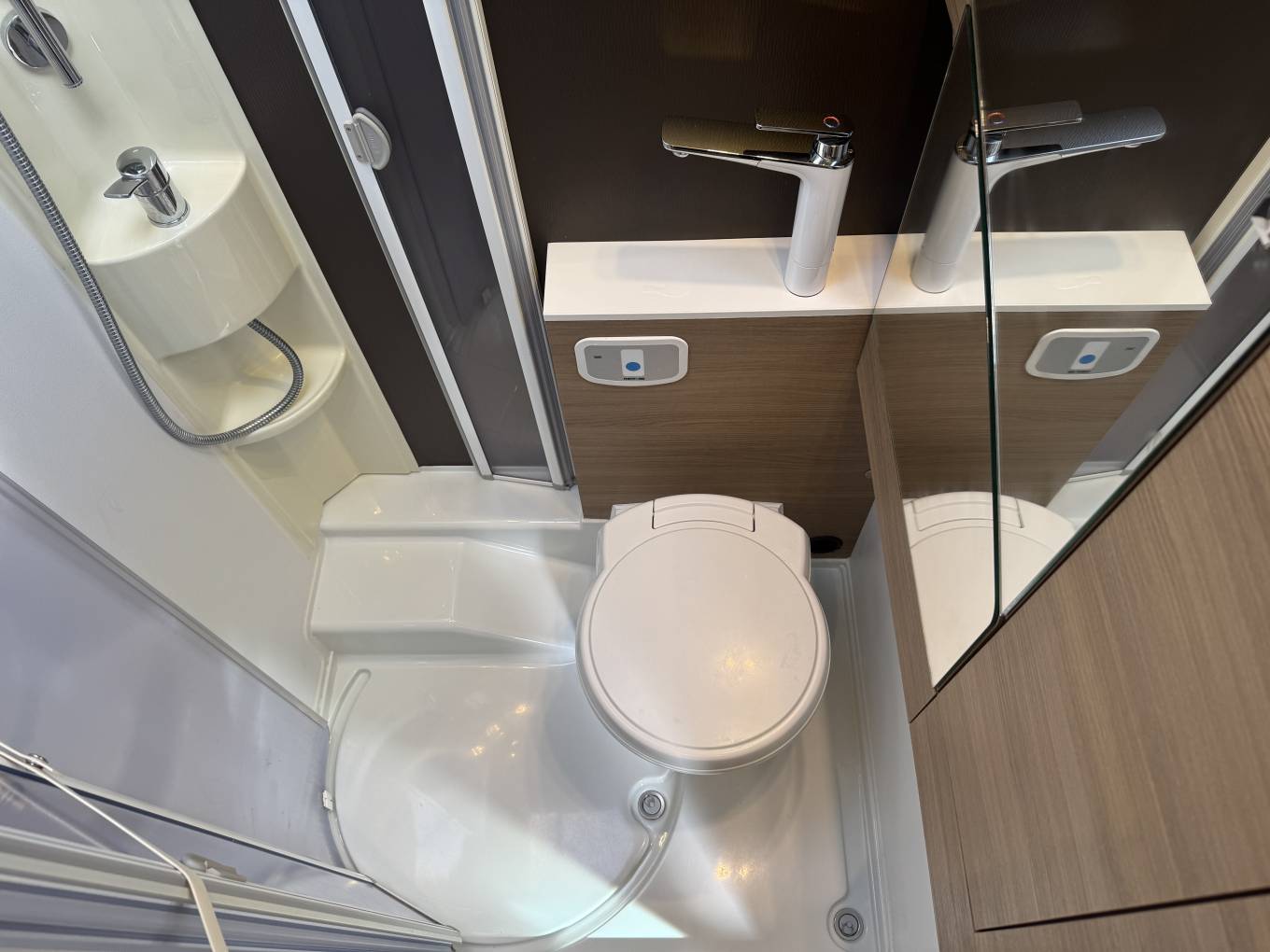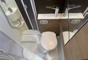 Moving through to the centre of the motorhome, there is a large washroom which includes a shower, wash basin with mixer tap (that folds up to maximise space when not in use), cupboards and a separate Thetford toilet with further storage units.