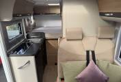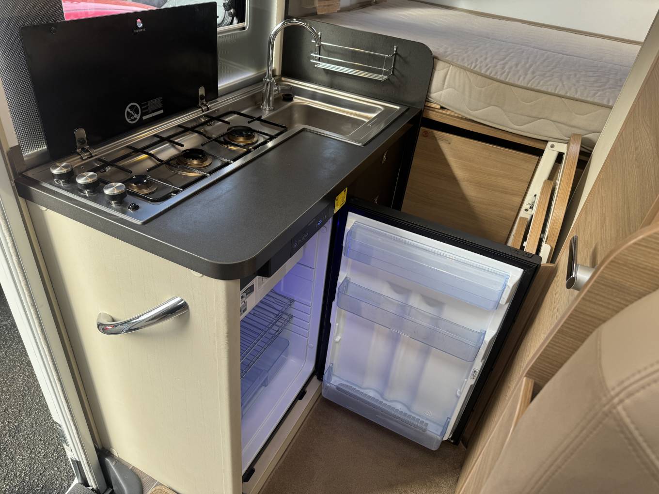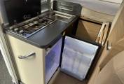 Carrying on through the motorhome, we come to the kitchen area where there is a three ring gas ring hob supplied from the gas bottles located in the external storage unit. Next to the cooker is the sink with mixer tap and last but not least there is a large 3 way Dometic fridge with freezer compartment.