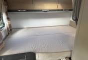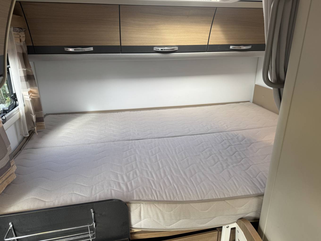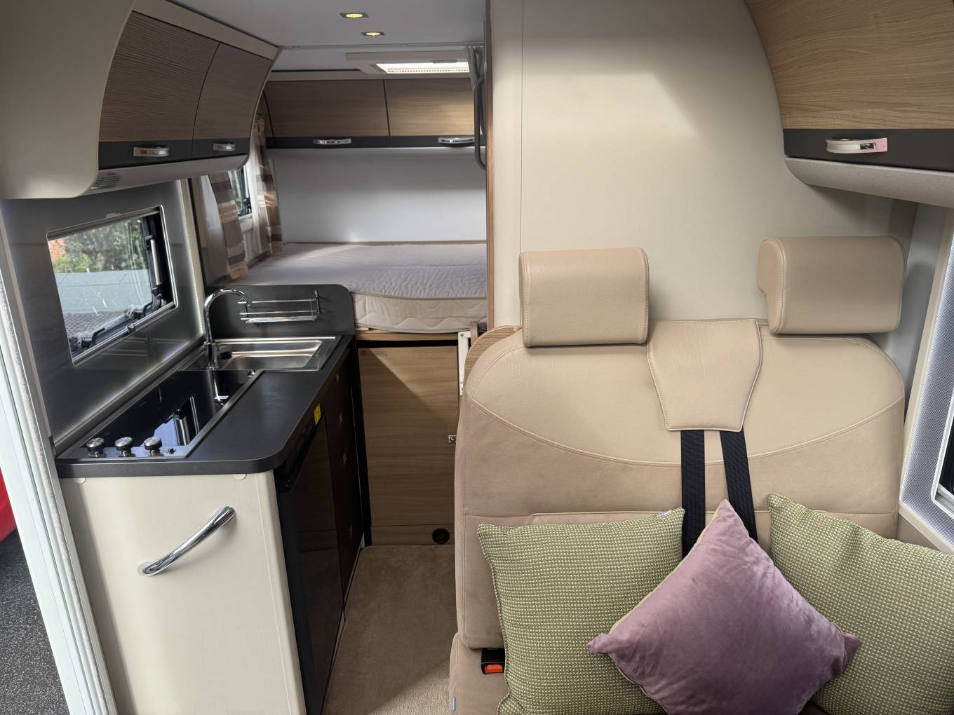 Starting with the rear of the motorhome, you have the extremely large fixed elevated double beds which are surrounded by multiple spot lights with plenty of storage space in the overhead cupboards. Underneath the bed is the large garage which has plenty of room to store items such as a drive away awning, bicycles, luggage and many other items.