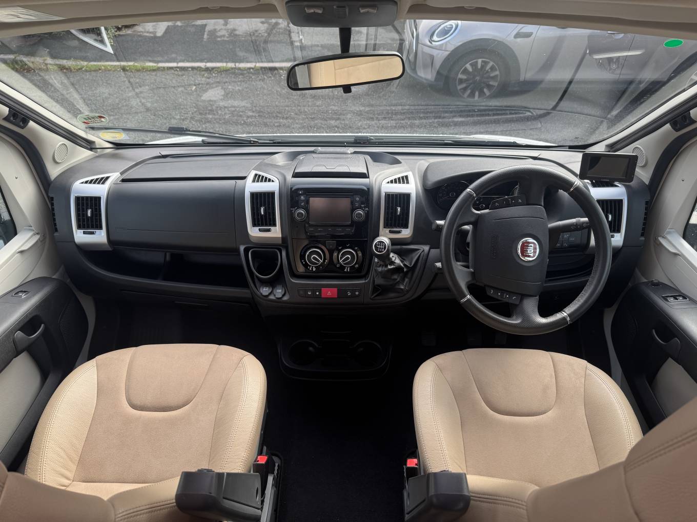 In the cab, the vehicle has a manual gearbox, a radio, Sat Nav, air conditioning and cruise control along with electric windows and mirrors..