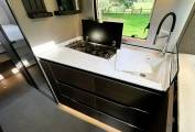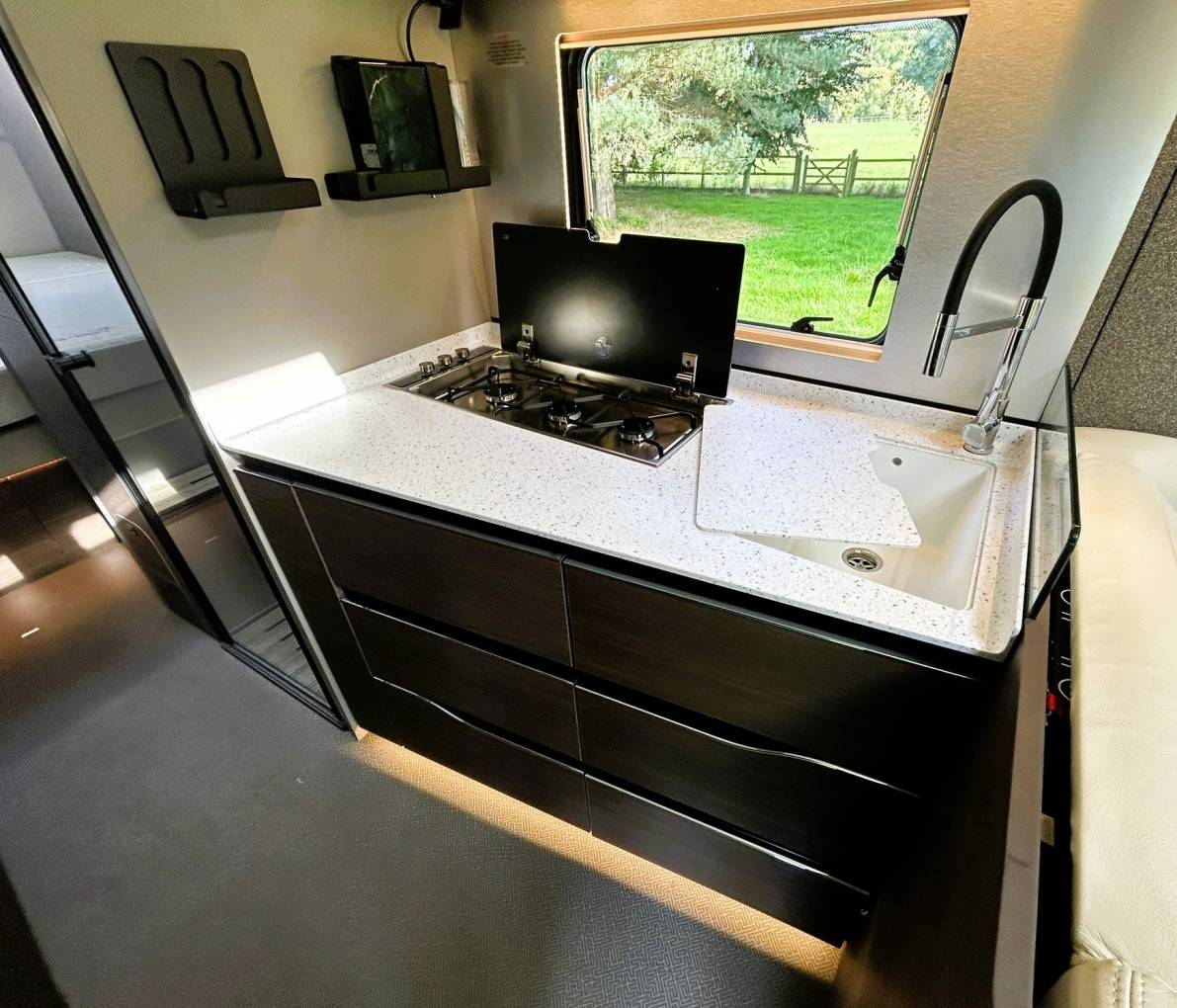 - Kitchen - Integrated 3-ring gas hob, sink with flexi-tap, Kerrock slim worktop, large soft-closing drawers, 177l TEC Tower absorption fridge-freezer with double-hinge opening and soft-touch controls. Integrated gas oven with grill. Nespresso® coffee machine