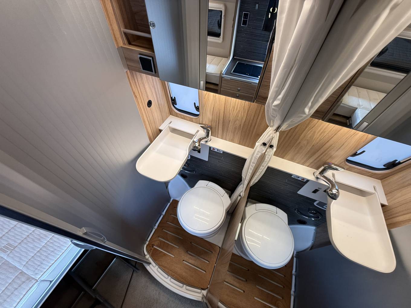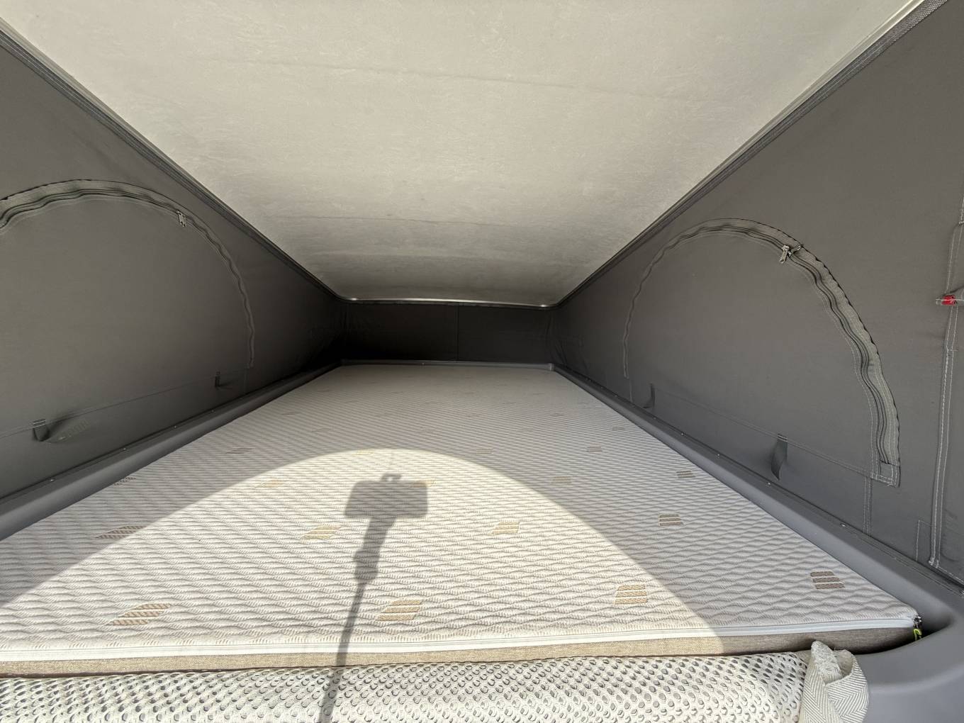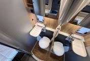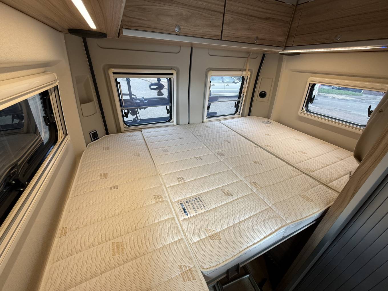 At the rear of this premium pop top campervan you will find the a comfortable double bed with under-bed storage. The centre section of the rear bed is easily hinged to create a garage store. Moving forward you will find the compact kitchen offering a good range of storage, 65 litre compressor fridge, two burner hob and sink, plus a hook on worktop extension. Adjacent to this is the practical washroom with flushing cassette toilet, drop down hand basin and shower providing home from home comfort and is a rare feature in a compact campervan. In the heart of the ampervan is the dinette area with side mounted lift up table opposite the swivel cab seats, so four can sit in comfort. With the table stowed, the ladder can be attached to access the upper roof bed, probably the best poptop bed you will ever find, with the mattress in an inset fixed base, high lift, quality canvas with plenty of light and air, safety net.