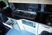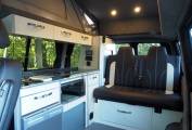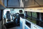 The front passenger seat swivels easily into the dinette, a stylish area with gloss units, two tone fabrics and an unmarked grey floor. Here you will also find a two burner hob, gas grill, 12v fridge, pull out cutlery drawer, storage cupboards, lockers and corner wardrobe. There is also a hook on table, stowed behind the drivers seat.