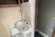 Washroom: Practical corner washroom with a practical swing-wall design that folds to create a separate shower enclosure