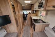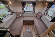 The Swift Escape 644 is a 4‑berth over-cab coachbuilt motorhome built on a Fiat Ducato chassis. It’s designed to offer a compact overall footprint while still providing a comfortable living space for up to four people. It features two double beds: one in the over‑cab (above the driver’s cab) and another made by converting the rear U‑shaped lounge. It also has a central kitchen and a washroom mid‑vehicle.