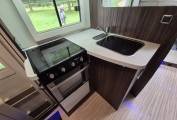 The kitchen has a square shaped stainless steel sink unit with glass lid and chrome mixer tap, the hob is dual fuel with two gas burners and an electric hotplate, gas grill and oven beneath, opposite is a tall fridge with separate freezer, which works on gas, 12v and 240v and there's a built-in microwave oven above. There are plenty of cabinets and drawers to store away all your holiday provisions.