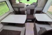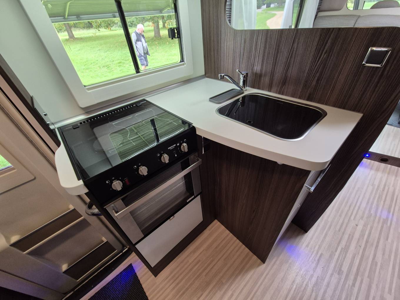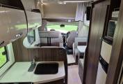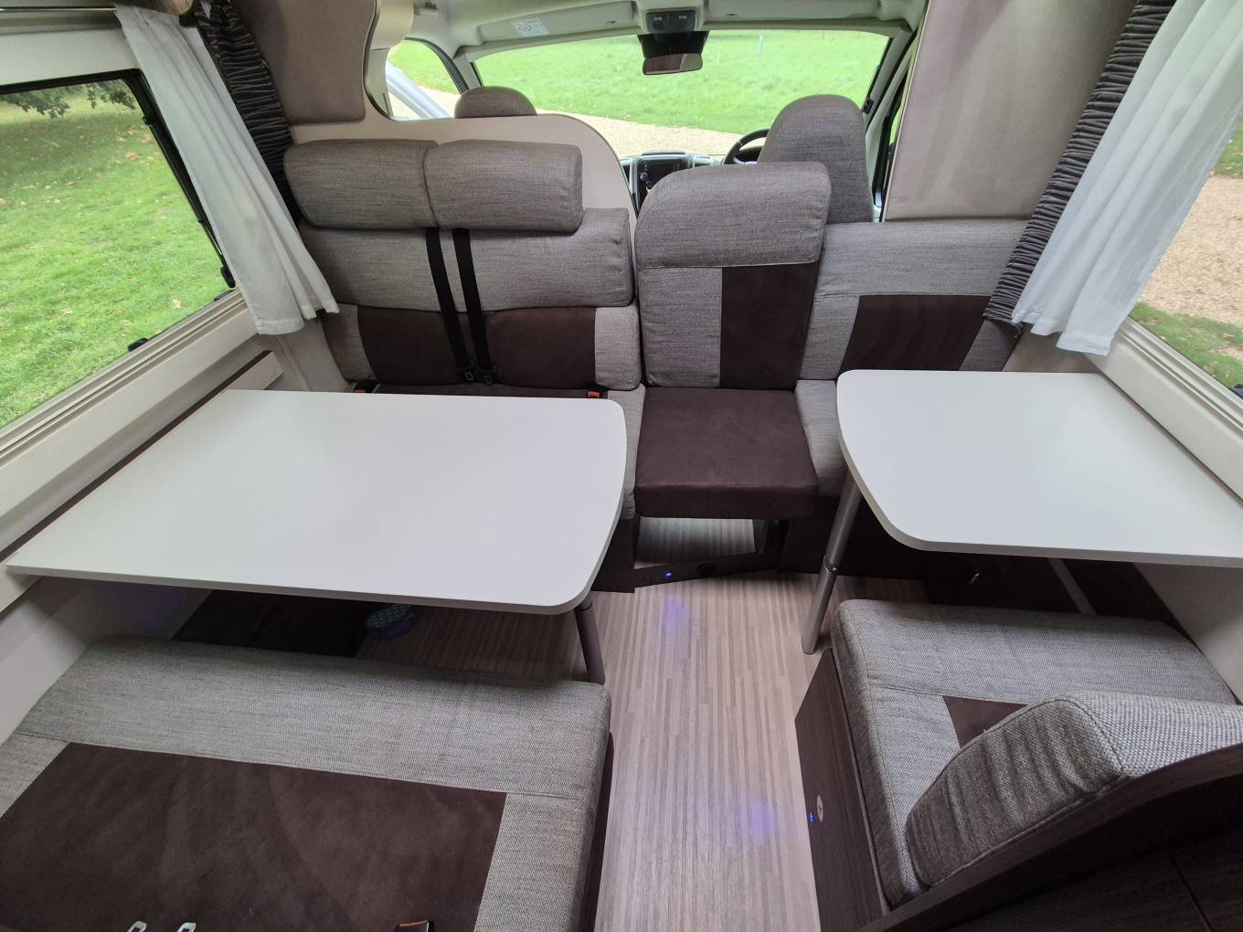 The dining and lounge area has four seats on the nearside, all with 3-point seat belts, plus a large extending dining table. On the off-side there is a smaller dinette area for two people, a dining table so seating for six in total, although a cleverly designed extra seat between the areas allowing even more room if needed. This central dinette can also be made up into a good size double bed.