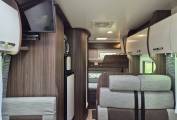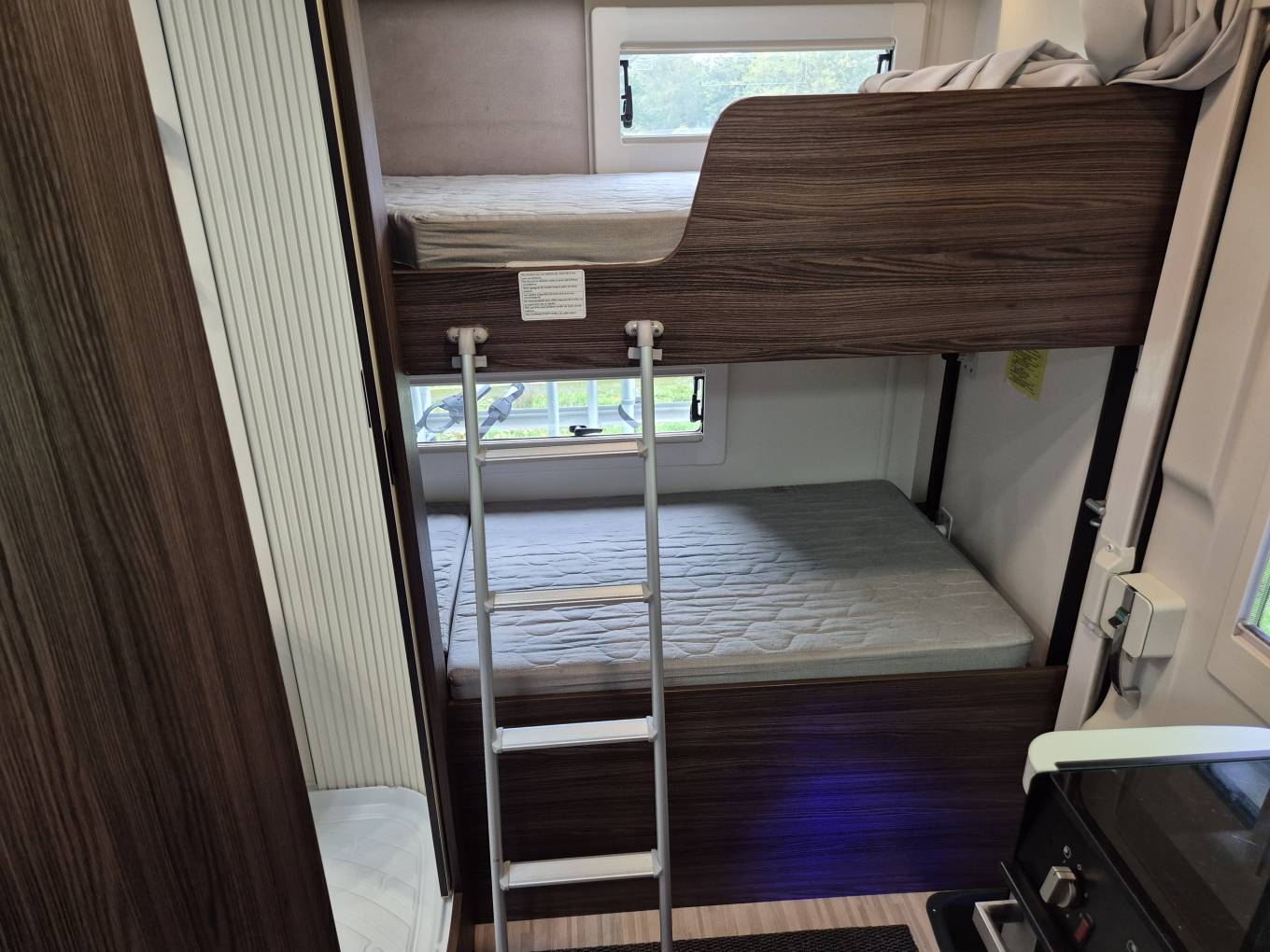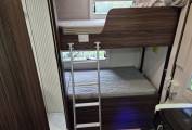 Enter the motorhome and the two rear bunks are to your right, they stretch across the whole rear of the van so can accommodate the tallest of people, an aluminium access ladder is provided and there are windows, privacy curtains and reading lights. The bottom bunk raises to reveal extra storage space.