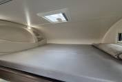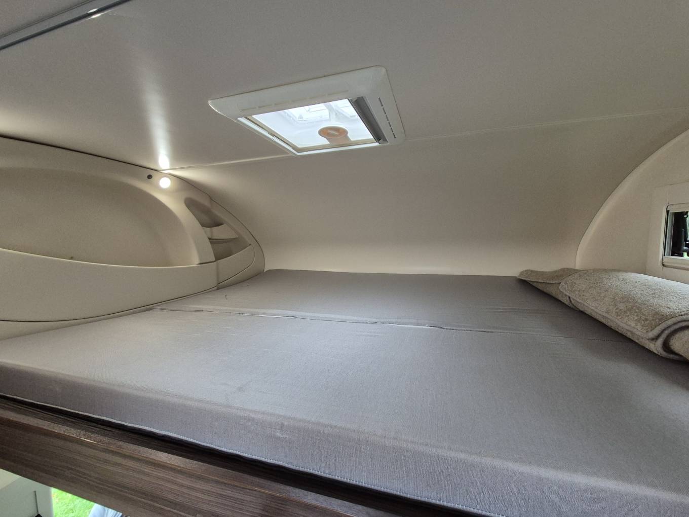 The over-cab bed is large and spacious, with a window, reading lights, privacy curtains and an aluminium ladder to access it.