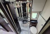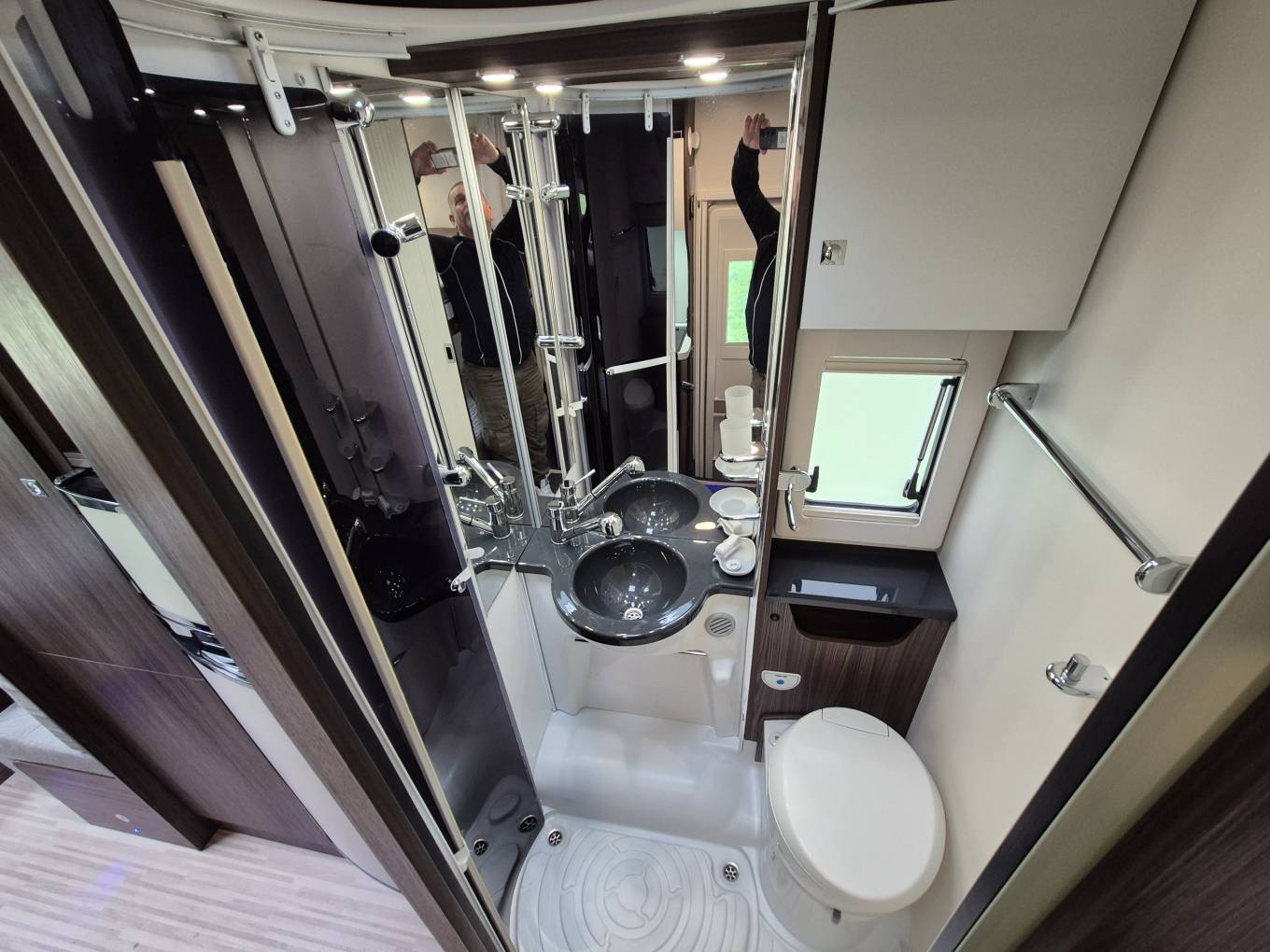 The washroom has a designer vanity unit with built-in wash basin, the tap pulls out to act as the shower handset and a rotary shower screen makes a separate shower cubicle, plus there's a Thetford cassette swivelling toilet with electric flush.