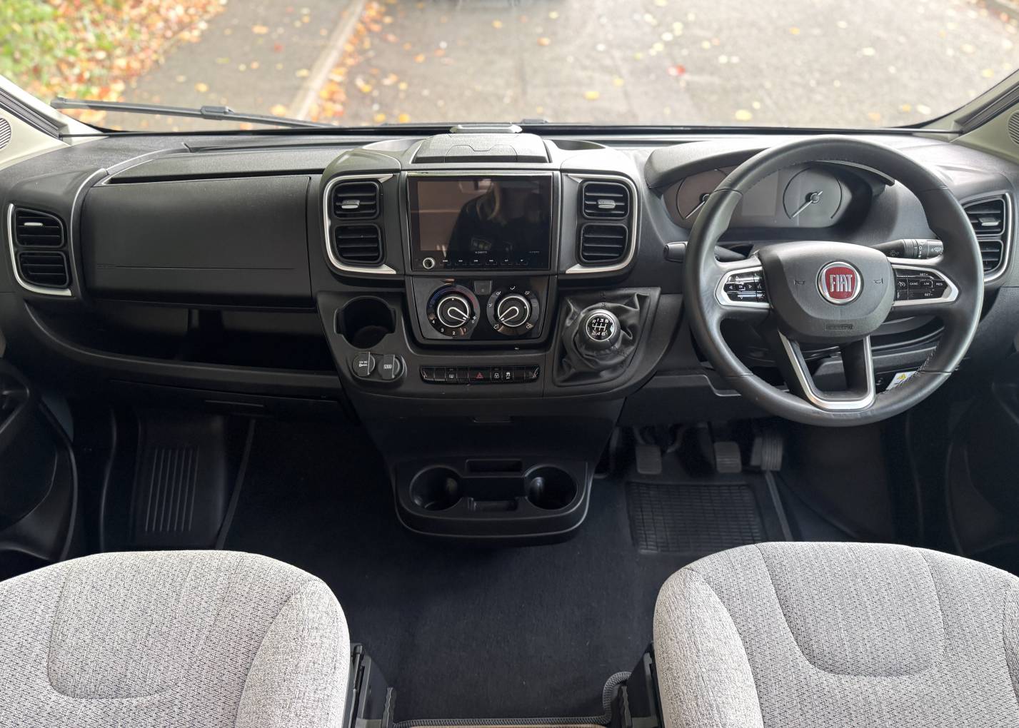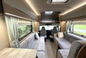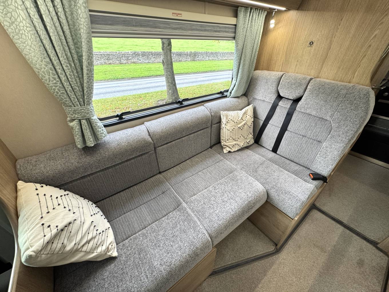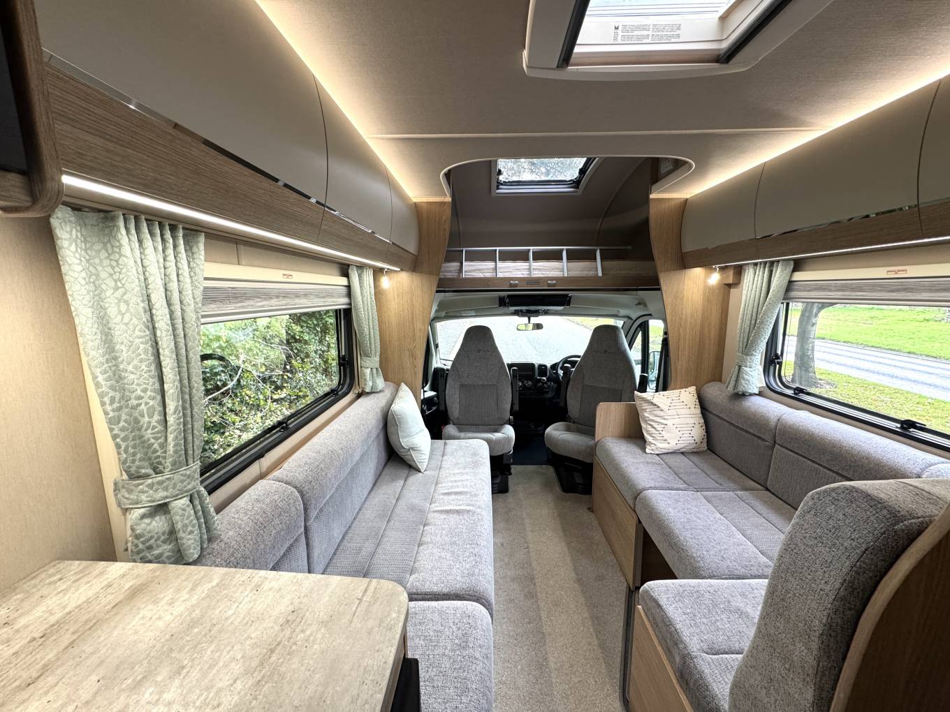 This particular vehicle comes with a fantastic list of extras, including a tow bar with electrics, wind-out canopy awning, and an upgraded Xzent media system featuring sat nav, DAB radio, Bluetooth connectivity, and a reversing camera. There’s also an Avtex drop-down TV, external BBQ point, and a roof-mounted solar panel for off-grid capability. Swivel cab seats, an electric entrance step, blackout blinds and flyscreens on all windows add to the comfort and usability of the space.