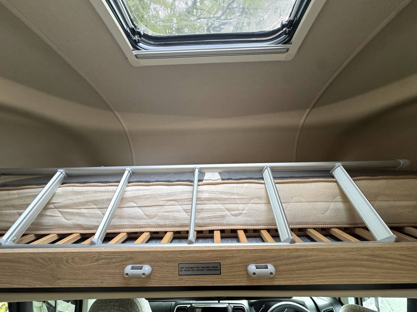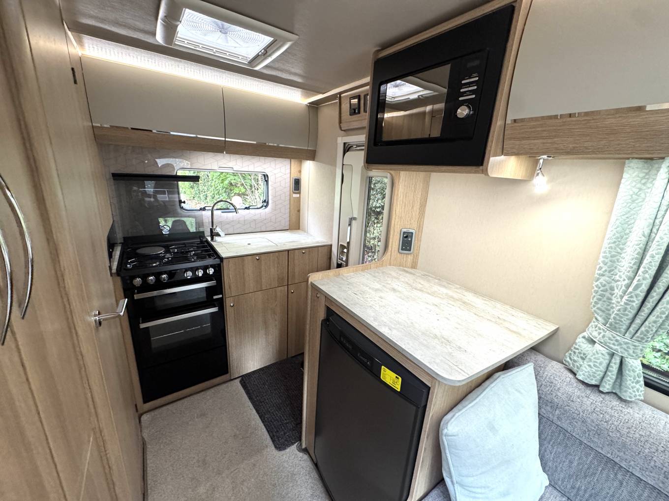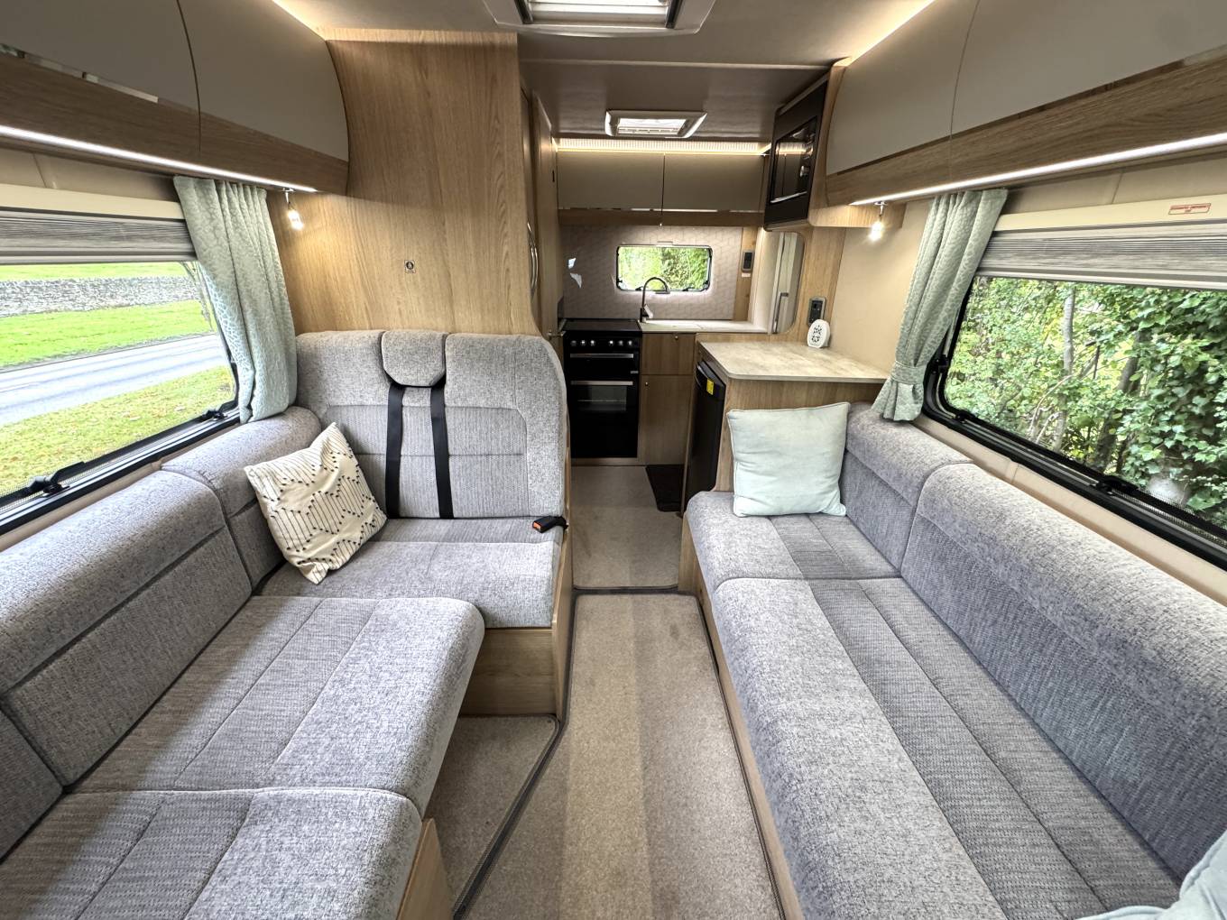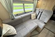 This particular vehicle comes with a fantastic list of extras, including a tow bar with electrics, wind-out canopy awning, and an upgraded Xzent media system featuring sat nav, DAB radio, Bluetooth connectivity, and a reversing camera. There’s also an Avtex drop-down TV, external BBQ point, and a roof-mounted solar panel for off-grid capability. Swivel cab seats, an electric entrance step, blackout blinds and flyscreens on all windows add to the comfort and usability of the space.