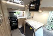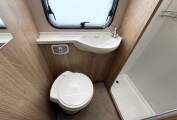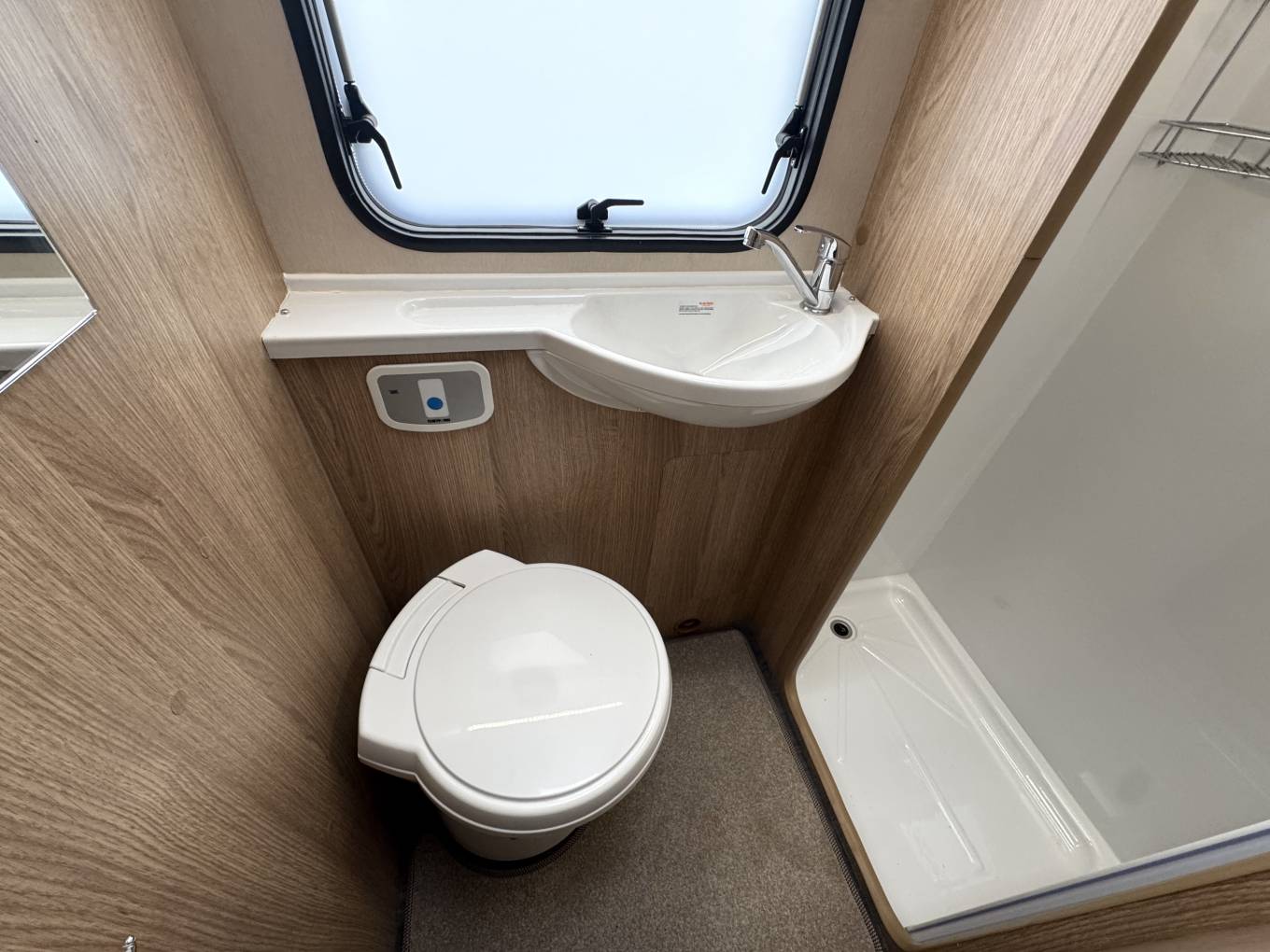 To the rear, the well-equipped corner kitchen includes a full oven and grill, dual-fuel hob, microwave, stainless steel sink and a 3-way fridge with freezer compartment. Opposite, the corner washroom features a cassette toilet, hand basin, and a separate shower cubicle, a real plus in a motorhome of this size.
