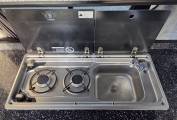 Kitchen Setup: 2-ring gas hob, sink with pop-up tap, 50L compressor fridge, stow-away, pop-up table & storage cupboards.