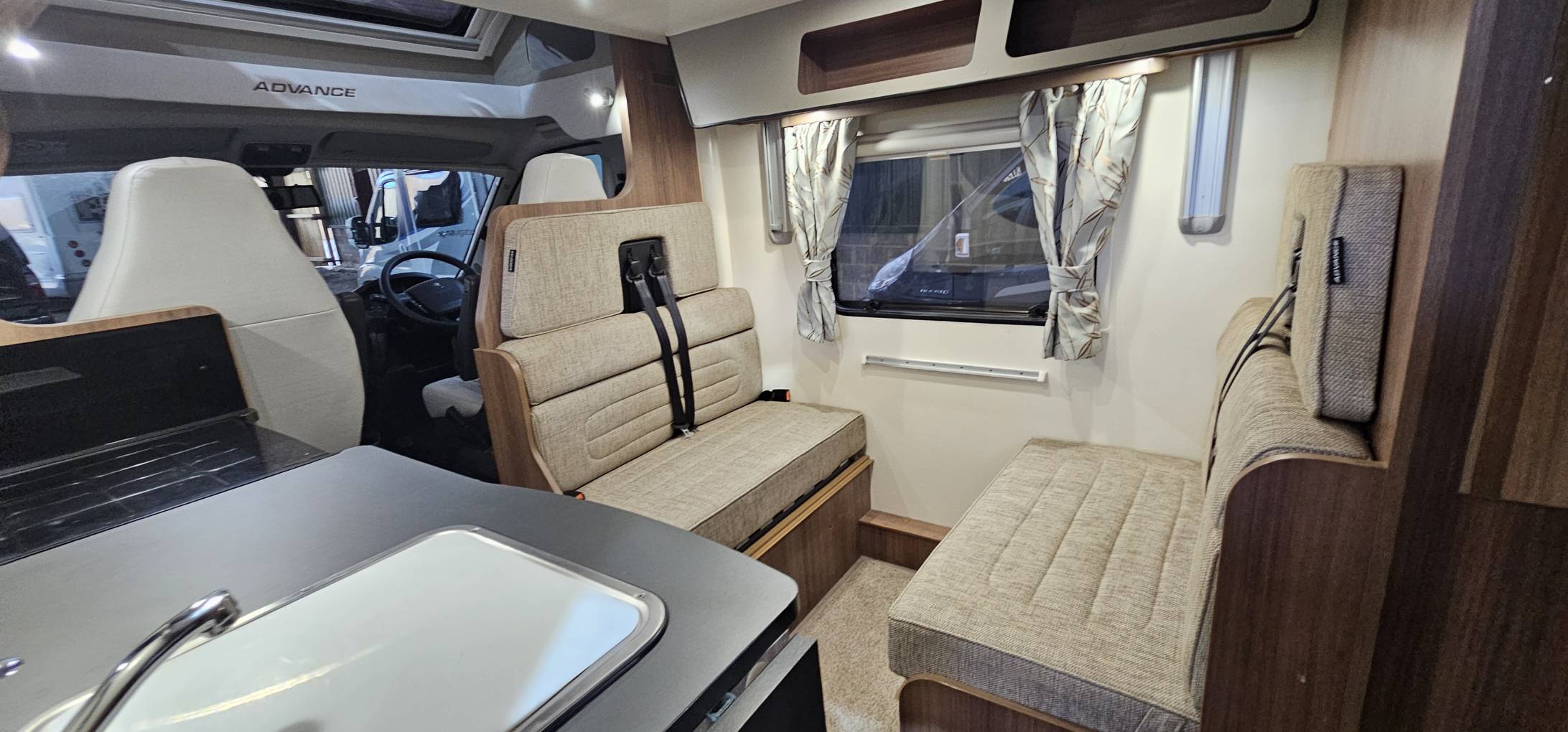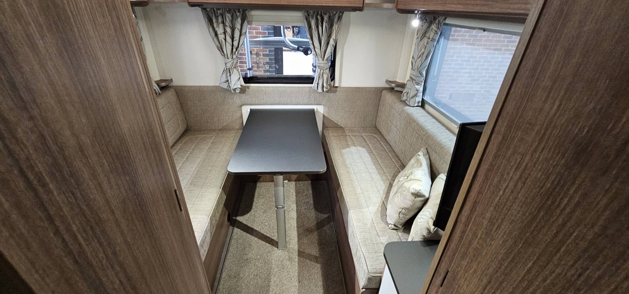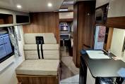 At the rear is a 2nd lounge dinette area with generous cabinets above and TV with power sockets and USB points below.