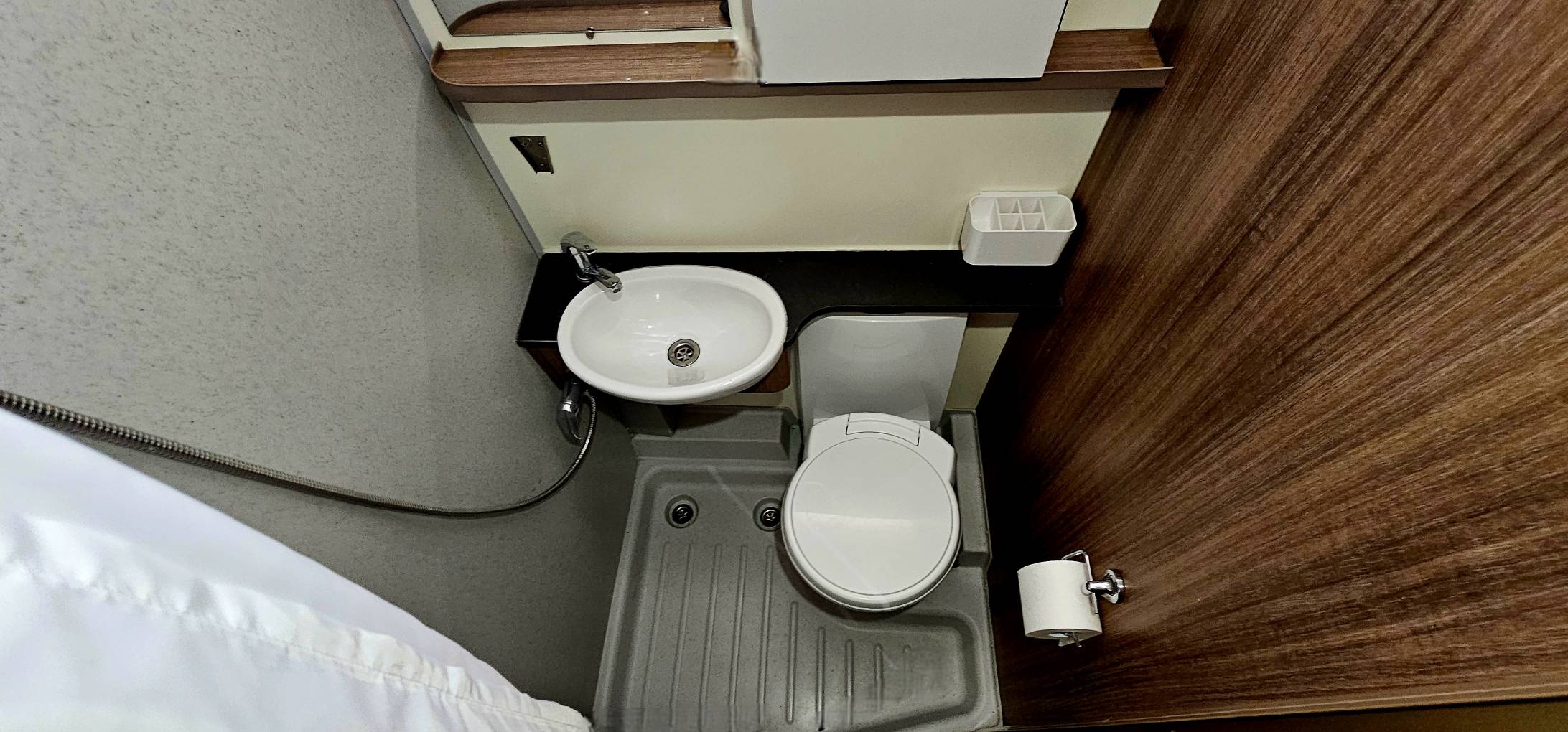 Mid ships there is a wardrobe, along with a good sized washroom with shower, toilet and sink with vanity cupboard.