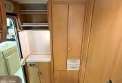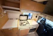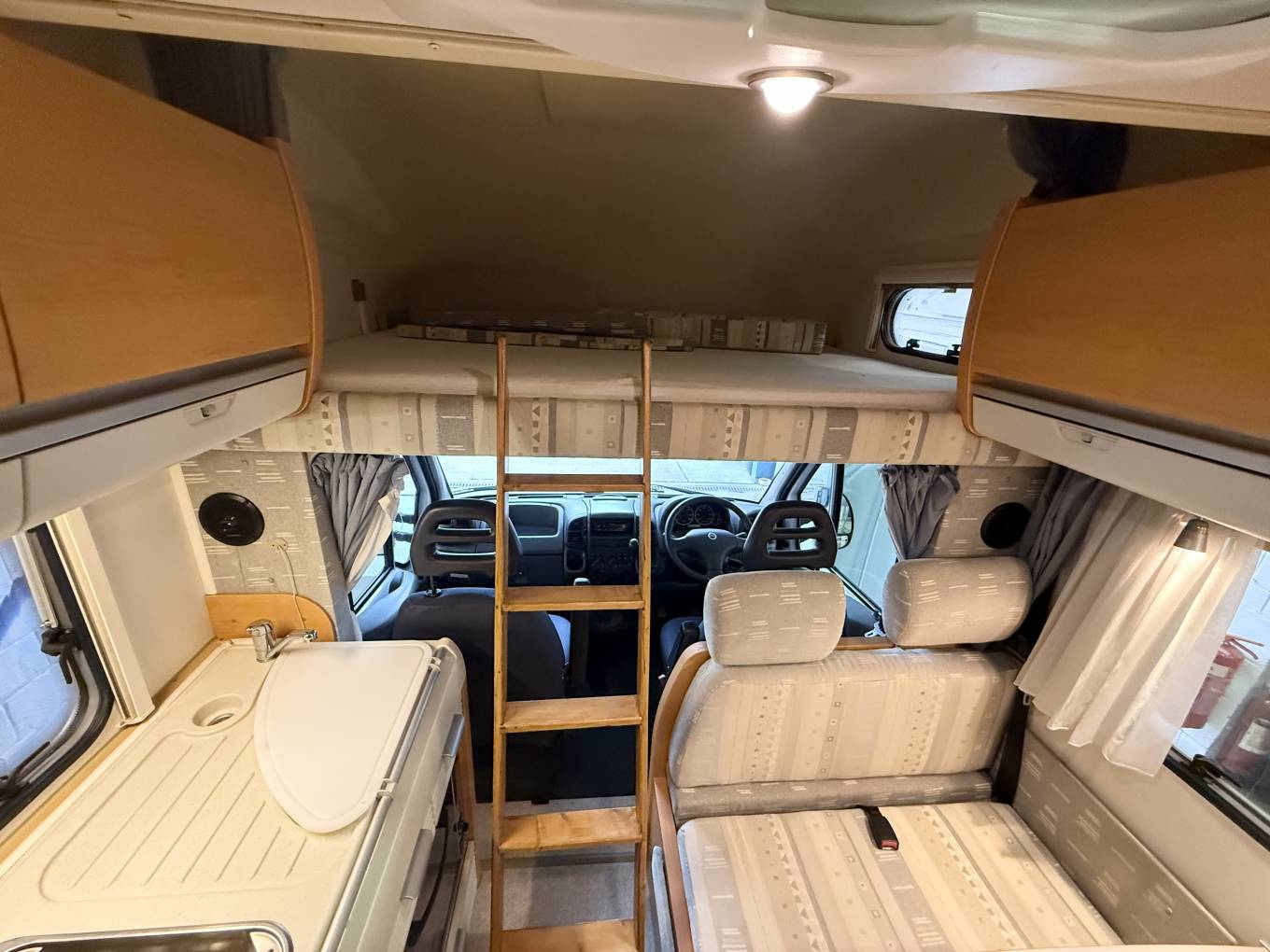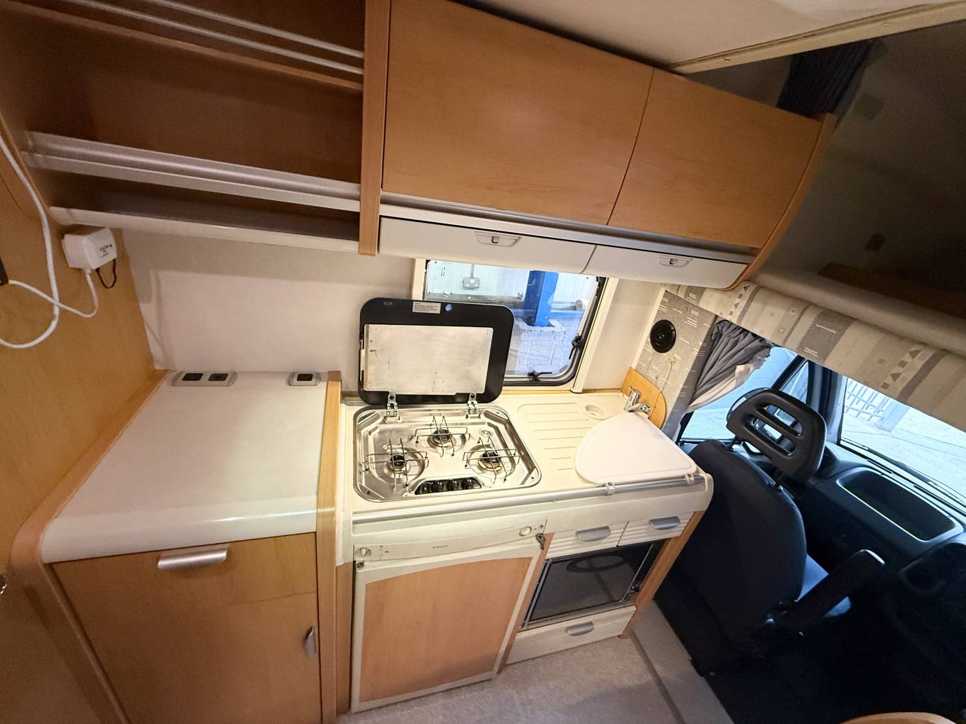 A fixed overhead cab double bed along with a dinette that sports two travelling seats with safety belts, and can be converted swiftly into another double bed to provide 4 berths. Plenty of space for up to 4 people to get around the table for dining, relaxing or those evening card and board games. A good kitchen space providing a 3 burner hob, sink with running hot and cold water and an under counter fridge with freezer box. There is storage from the undercounter cupboard with drawer and overhead lockers above both the kitchen and dinette area.