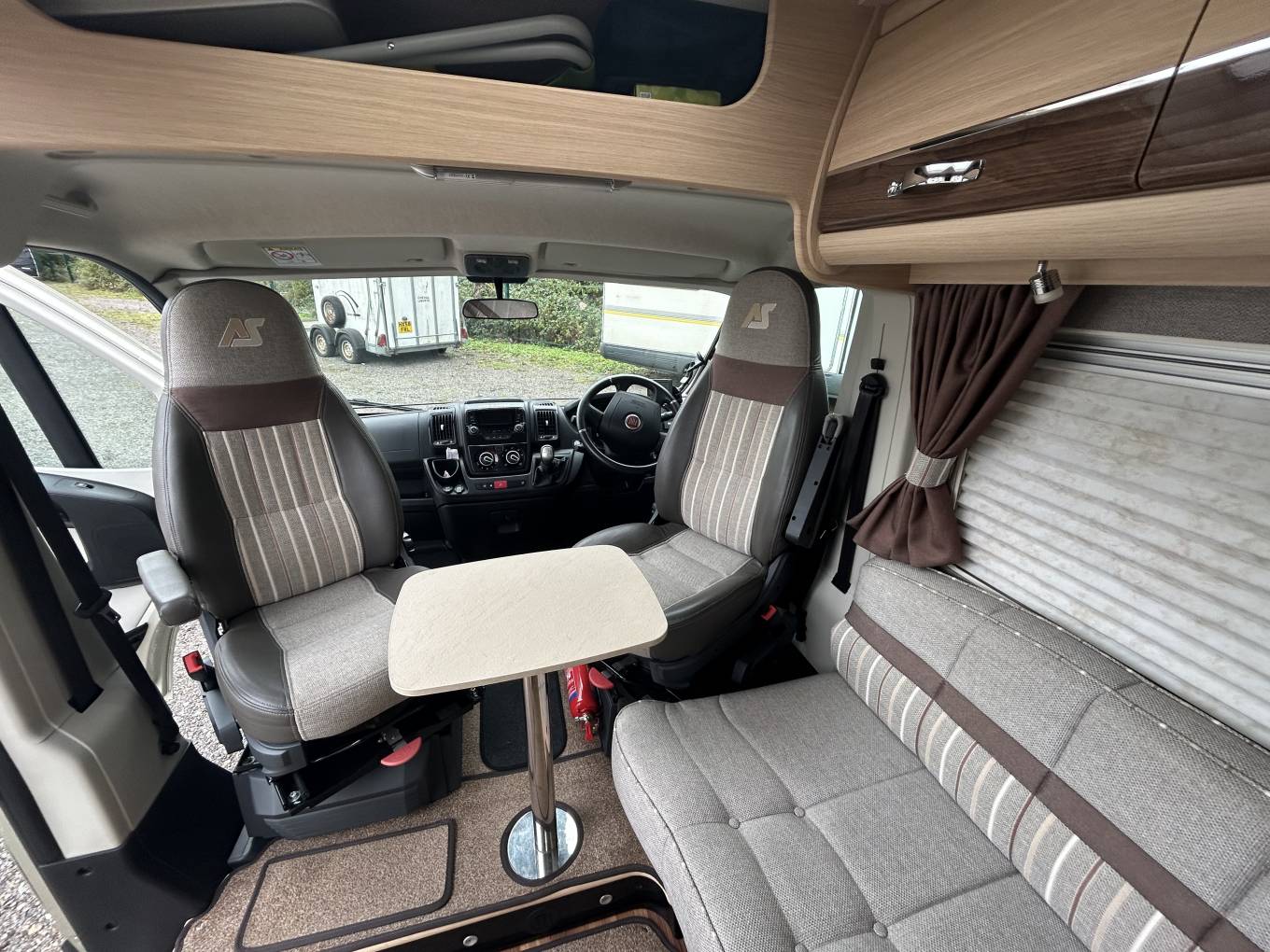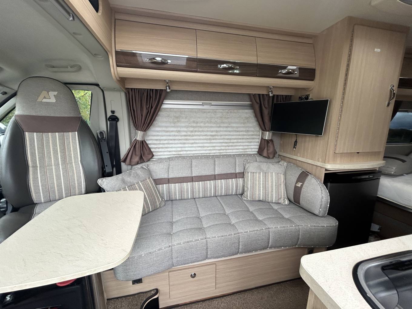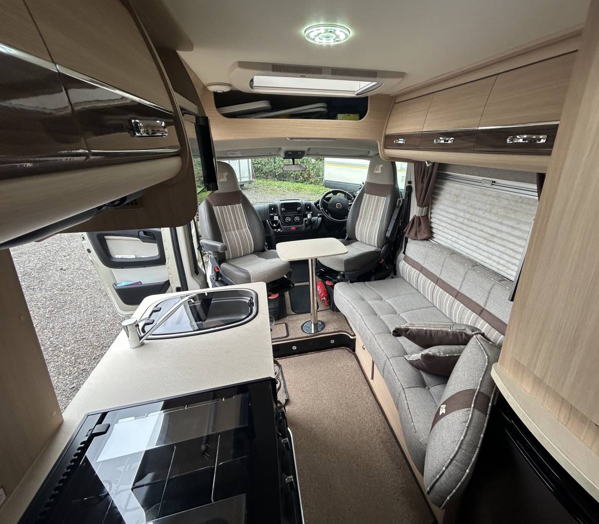 This Kingham is built on the Fiat Ducato chassis and has the Comfortmatic gearbox, giving you the option of driving as an automatic as well as a manual. It has a 2.3l engine and 130 BHP giving you all the power you need. It comes with cab air conditioning, cruise control, DAB radio and reversing camera making it a pleasure to drive. As mentioned, the Kingham has an excellent layout. At the front you have the lounge area that uses the two captains chairs and a double side sofa to give you the idea space to relax. It also has two different sized tables that can be set up when required. The motorhome also comes with a TV - current set up in the front seating area but can also be moved to when the bed is. Moving back the kitchen comes with oven, grill, 3 gas burners. microwave oven, sink with mixer tap and 3-way fridge.