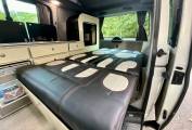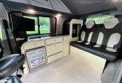 The rear bench converts quickly into a comfortable double bed, and additional storage underneath, including a wardrobe in the corner and additional storage throughout the kitchen area and back of the campervan.