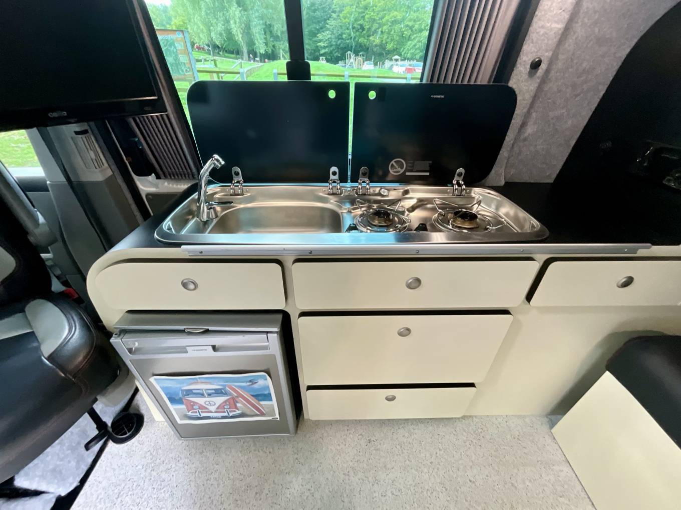 Both the driver and the passenger seats swivel to face a comfortable lounge which comes ready with a clip on table for meal times and socialising. For cooking and washing, two gas hobs sit in the kitchenette, coupled with a sink with water pump and a sizeable fridge with freezer. To heat up the van, an Eberspacher diesel heater is present.