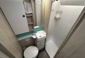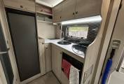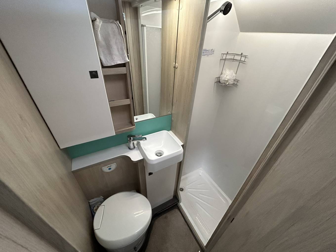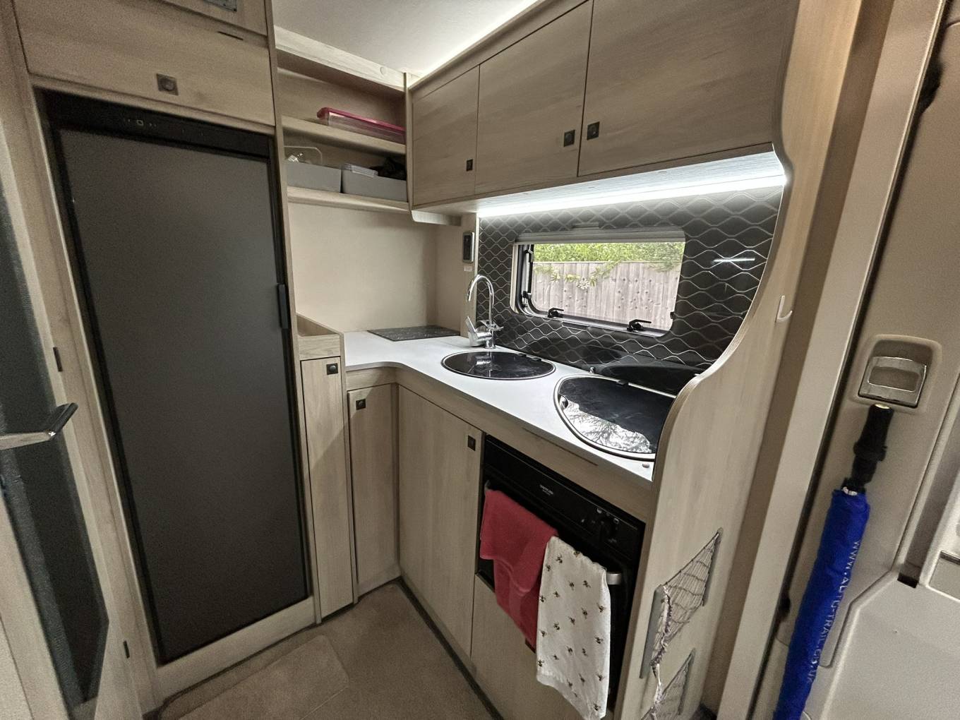 The kitchen is compact but well-equipped, with a full sized 3-way fridge freezer with automatic selection, 3 gas hobs, a sink with a mixer tap, and ample storage. The rear washroom includes a separate shower, cassette toilet, and wash basin – a standout feature in a van of this size.
