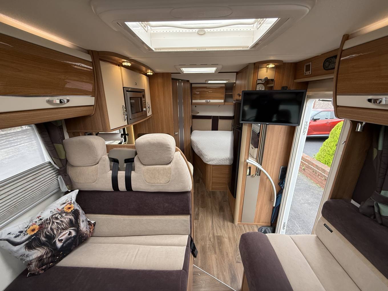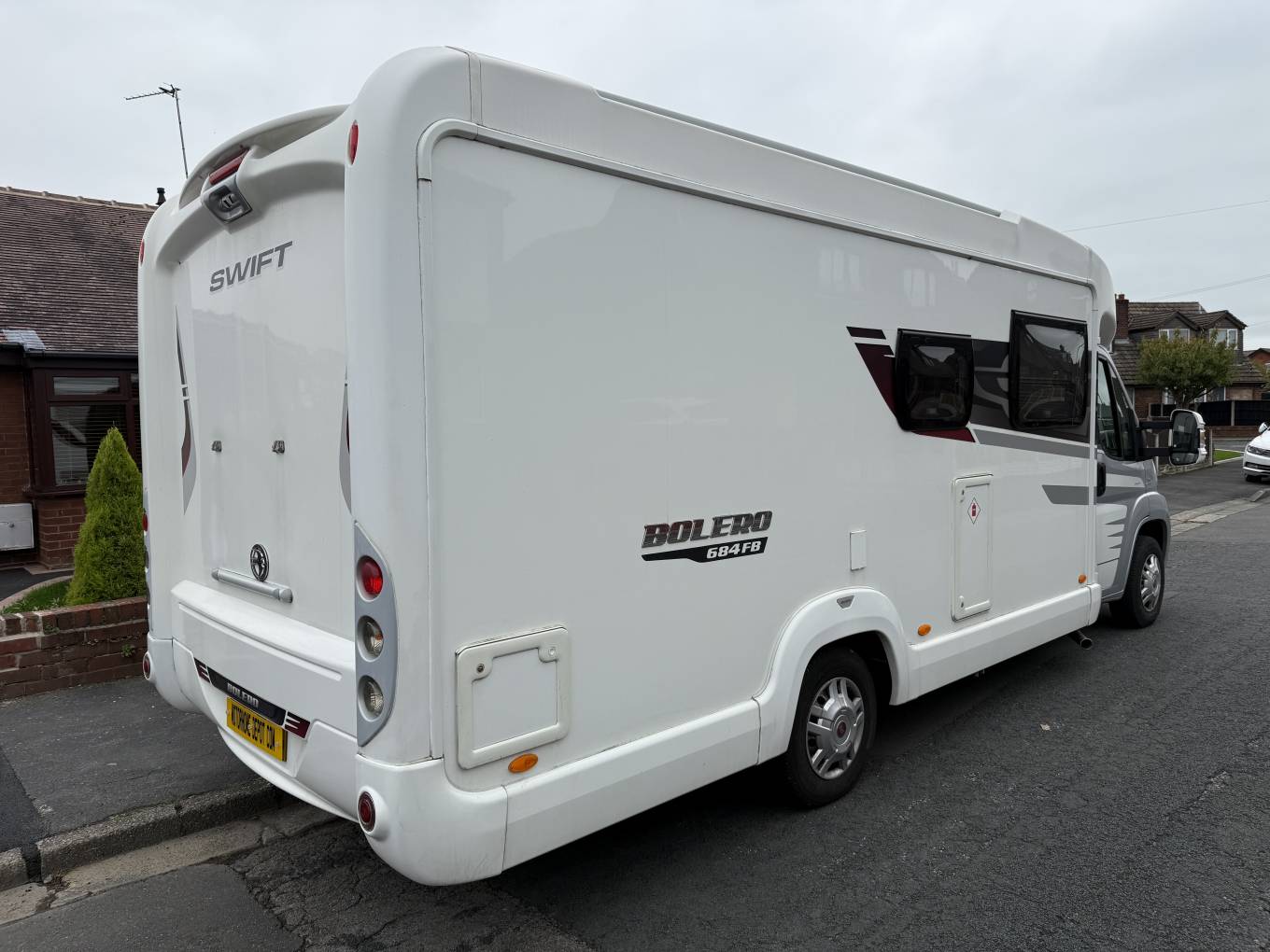 Swift Bolero 684FB, Spacious 4 Berth with Fixed Rear Bed and 4 Seat Belts. This mortorhome has been re plated to 3,500kg allowing it to be driven on a standard licensel. It is built on the Fiat Ducato chassis with 2.3 engine and 6 speed gear box, it has been well maintained and has done 25,251 miles. It has a beautifully finished interior and the layout comprises a rear fixed french bed and next to this is a good sized bathroom with separate shower compartment. In the centre there is a well equipped kitchen including an integrated microwave and at the front is the lounge area with bench seating and 2 captains seats. It comes with Cab Air Con, Cruise Control, Rear Camera System, DAB Radio, Sat Nav, Gas It Refil System, TV, Canopy Awning, Solar Panel, 2 X Leisure Batteries and 2 sets of keys. An excellent example available for viewing by appointment in Preston, call for more photos, videos and information.