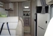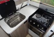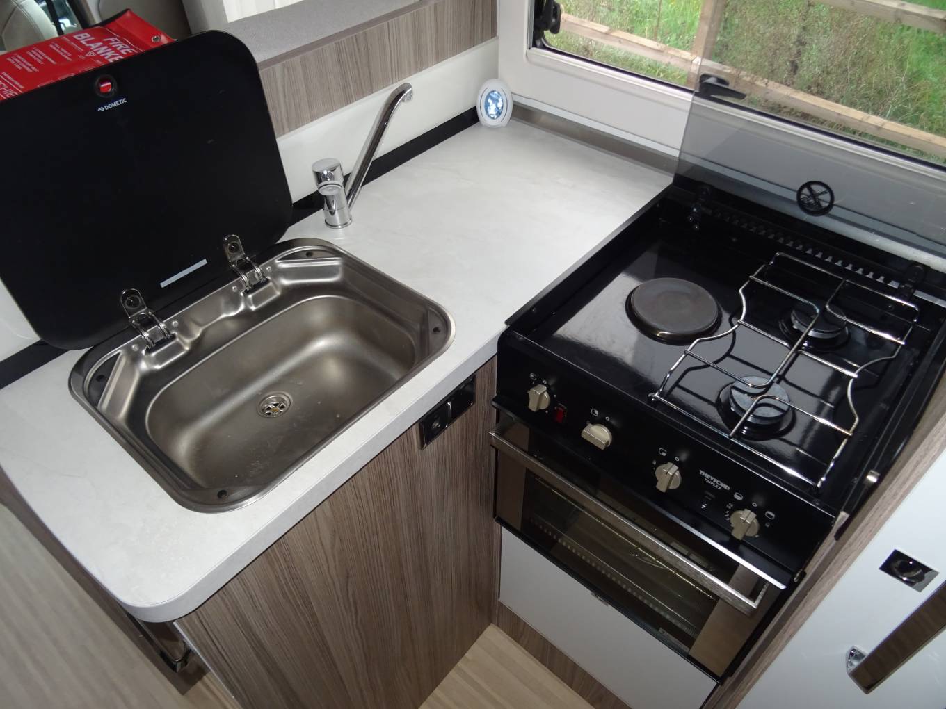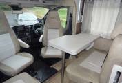 As you enter the side door moving to the front you have the spacious dining / lounge area that has 2 rear seat belts and comes with a removable table. Both front seats swivel round making this a nice area to relax in. Above this area you have an electric drop down bed that is easy to set up and a good size double.