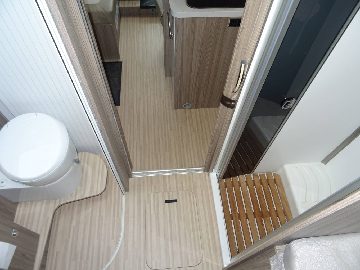 Moving round you have the central washroom with chrome mixer tap, mirror, storage locker, toilet with electric flush.and opposite a separate walk in shower cubicle with shower with bi-fold door.