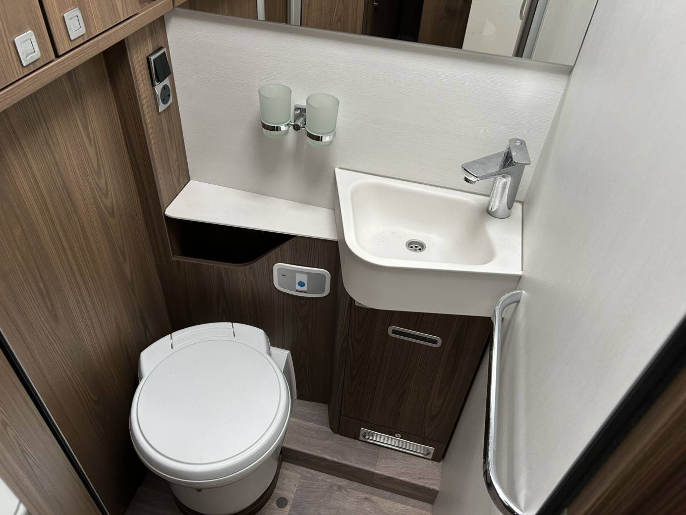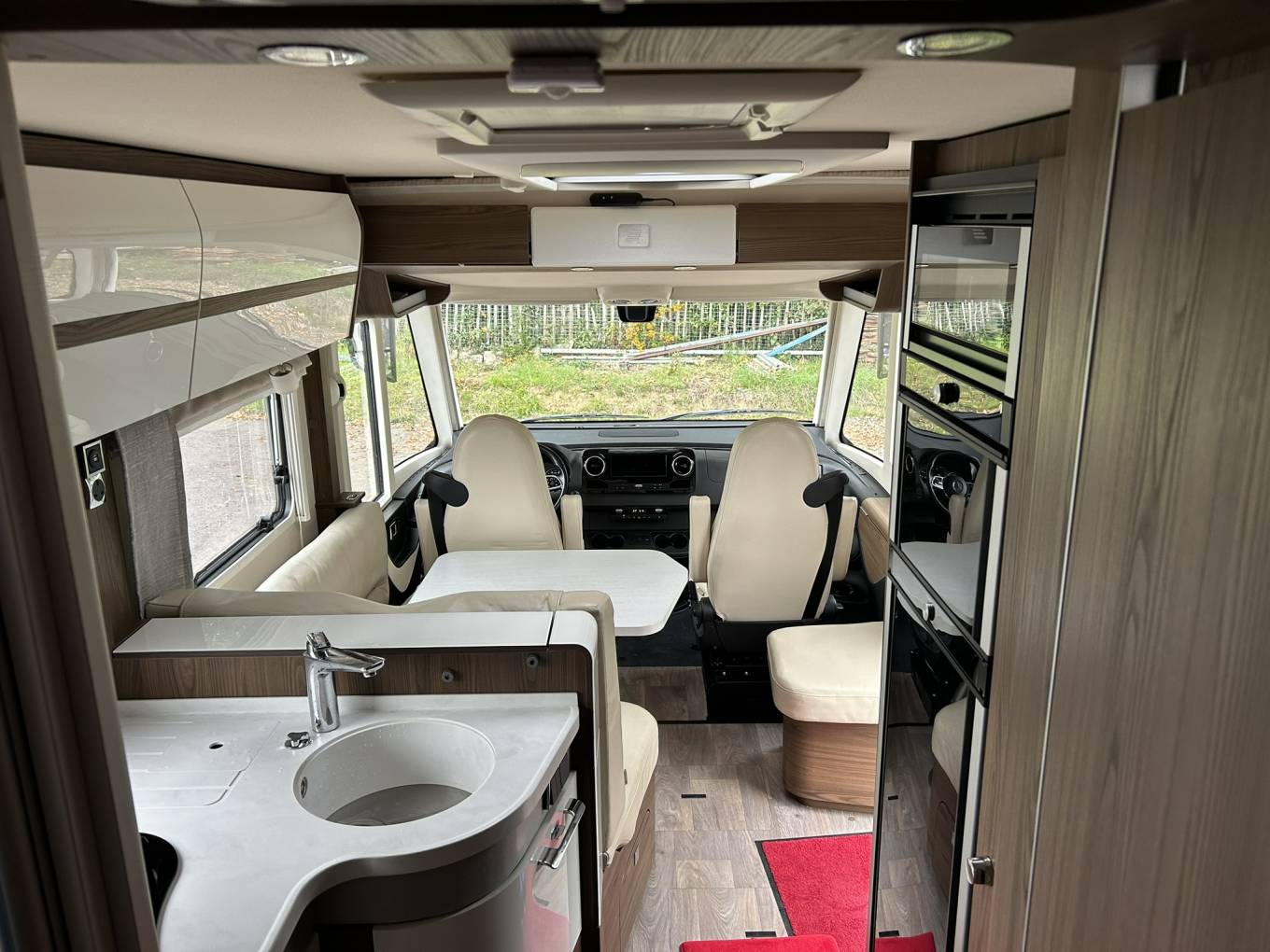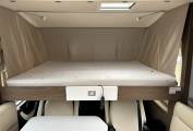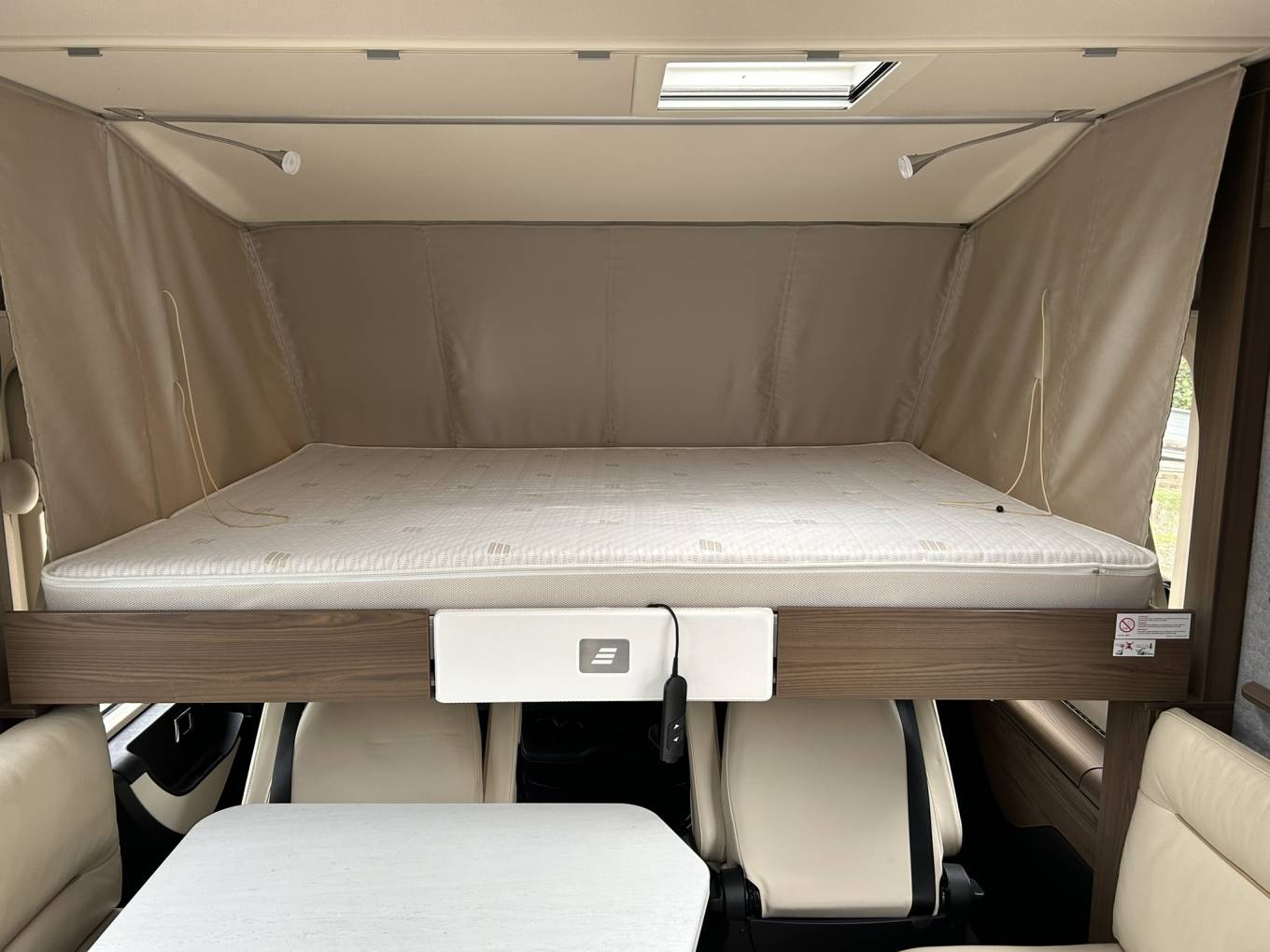 The cab has the usual Hymer large windscreen with an electric blind. Other features are an automatic gearbox, Apple Car Play, reversing camera, adaptive cruise control and 2 x captain swivel seats. Above the cab is an electric drop down bed. There are also blinds to both side windows.