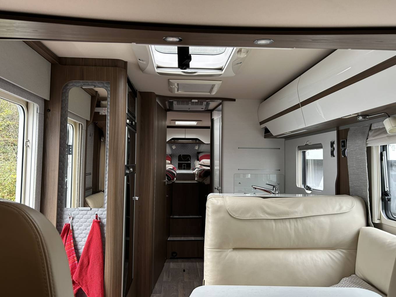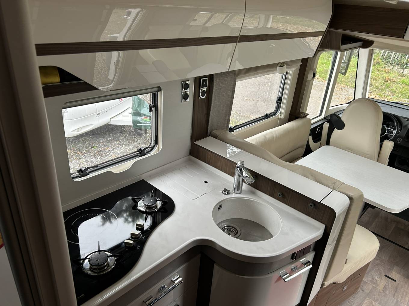 To the right of the kitchen is a comfortable L shaped dining/lounge area with luxurious cream leather upholstery, a single seat and a large table. Incorporated into the front facing bench is a large drop down TV. The table slides and turns to provide easy options when dining. The 2 captain swivel seats create seating for up to 6 people.