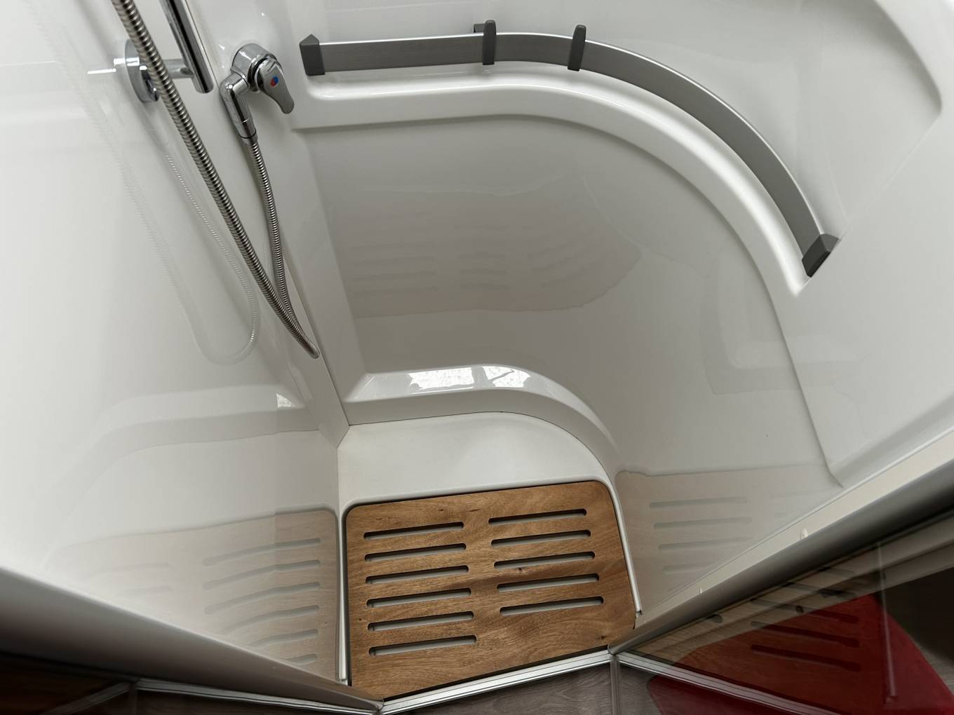 To the left of the kitchen is a large wardrobe a washroom with cassette toilet, hand basin with mixer tap, mirror and storage. Opposite the washroom is a separate shower cubicle. There are 2 doors, one to create an en-suite bedroom and one to separate the bedroom from the van.