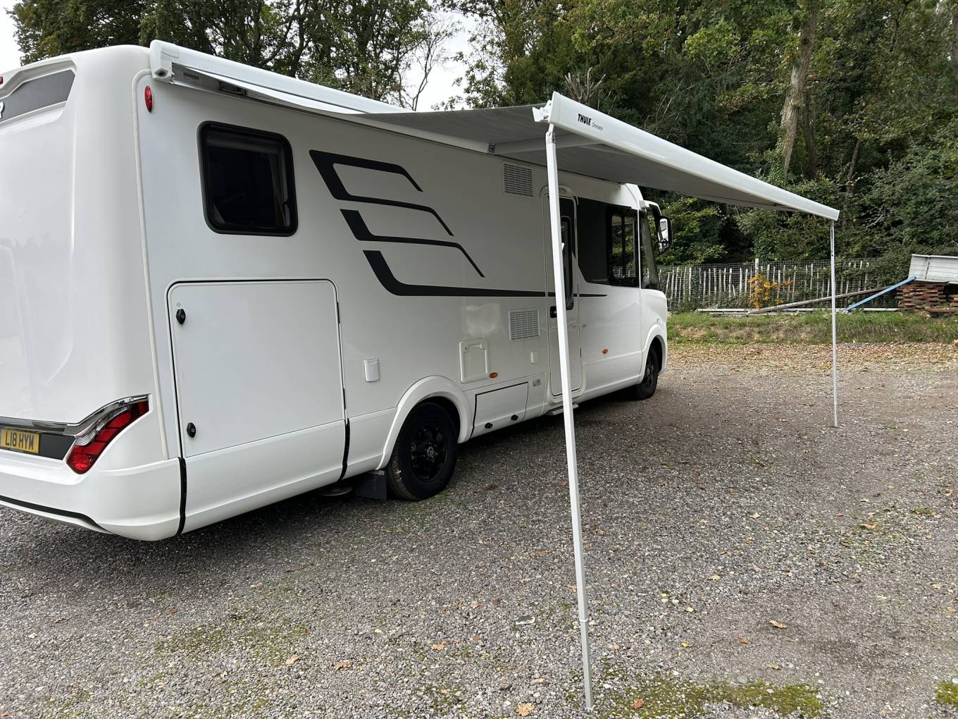 Outside the motorhome you have hydraulic levelling system, 2 x solar panels, 3 x leisure batteries, satellite, TV aerial, alloy wheels, spare wheel, Safefil Gas system with 2 bottles, BBQ point, hot and cold water external shower and wind out Thule canopy.